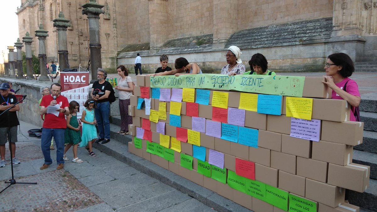 La concreción plástica de esta realidad se llevó a cabo en la Plaza de Anaya de Salamanca, donde se cosntruyó El muro de la injusticia, que produce deshumanización y empobrecimiento, debido a la ausencia de amor, de fraternidad, de justicia, y que «los militantes obreros cristianos -junto otras muchas personas de buena voluntad- queremos transformar, porque nuestra fe en el Dios creador y liberador, el dios de Jesús, nos llama a exigir que el trabajo sea digno para que la sociedad sea decente», según expresaron los dinamizadores del gesto, antes de ser derribado el muro.