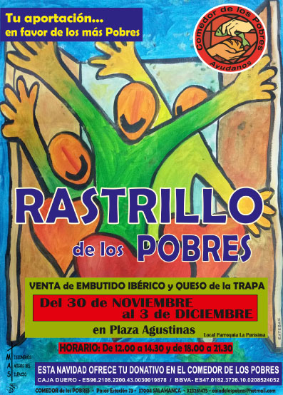 El Comedor de los Pobres organiza su tradicional Rastrillo solidario que se va a llevar a cabo del 30 de noviembre al 3 de diciembre en el local parroquial de La Purísima, en la Plaza de las Agustinas, en horario de 12.00 a 14.30 y de 18.00 a 21.30 horas. Los fondos recaudados irán destinados a paliar los gastos del Comedor que atiende a personas en situación de exclusión, a través del reparto de comida caliente, lotes de alimentos y la atención integral a familias, entre otras actividades.