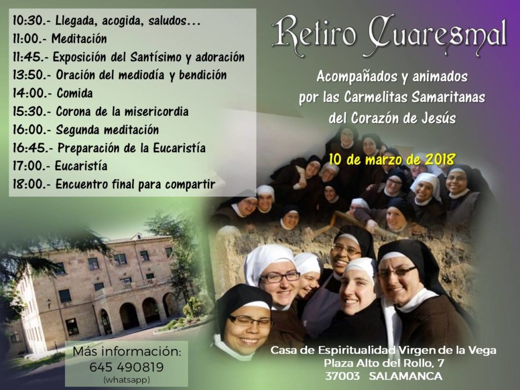 El sábado 10 de marzo se va a celebrar un retiro de cuaresma en la Casa de espiritualidad Nuestra Señora de la Vega, en la Plaza Alto del Rollo de Salamanca. El retiro, abierto a cuantos quieran participar, está organizado por el sacerdote diocesano José Carlos López Alejo y la comunidad de Carmelitas Samaritanas del Sagrado Corazón de Jesús.