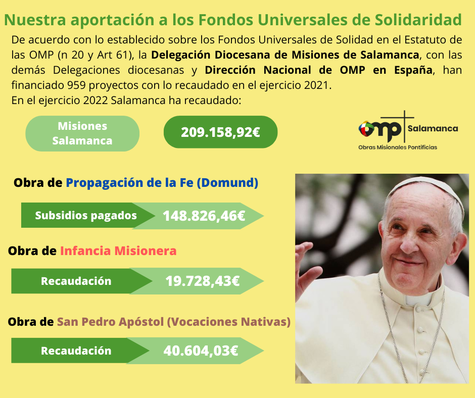 El Servicio de Misiones de la Diócesis de Salamanca recaudó en 2022 un total de 209.158,92 euros, 60.177,07 euros más que el año anterior, que destinó al Fondo Universal de Solidaridad de las Obras Misionales Pontificias (OMP), cuyo administrador es el Papa, y que tiene como fin sostener el trabajo de la Iglesia en los 1.119 territorios de misión.