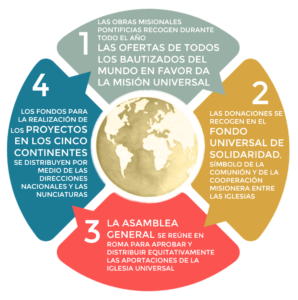 Cada año aquellas iglesias del mundo que presentan dificultades para llevar a cabo su misión evangelizadora, por falta de medios personales y económicos, se dirigen a OMP solicitando ayuda de la Iglesia universal para seguir adelante. El Santo Padre cuenta con todos los bautizados para sostenerlos a través de este Fondo Universal de Solidaridad de las OMP que recoge las aportaciones de todos los países, según sus posibilidades, y las distribuye de forma equitativa y justa, con el fin de garantizar que los territorios de misión reciban esta ayuda de la Santa Sede y puedan llevar a cabo sus proyectos.