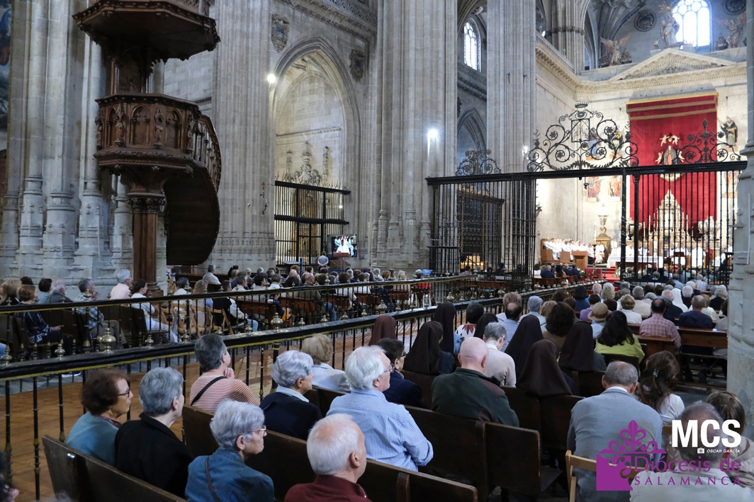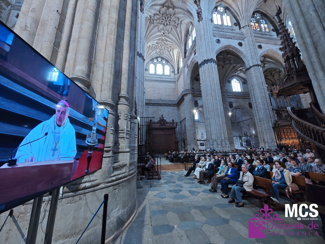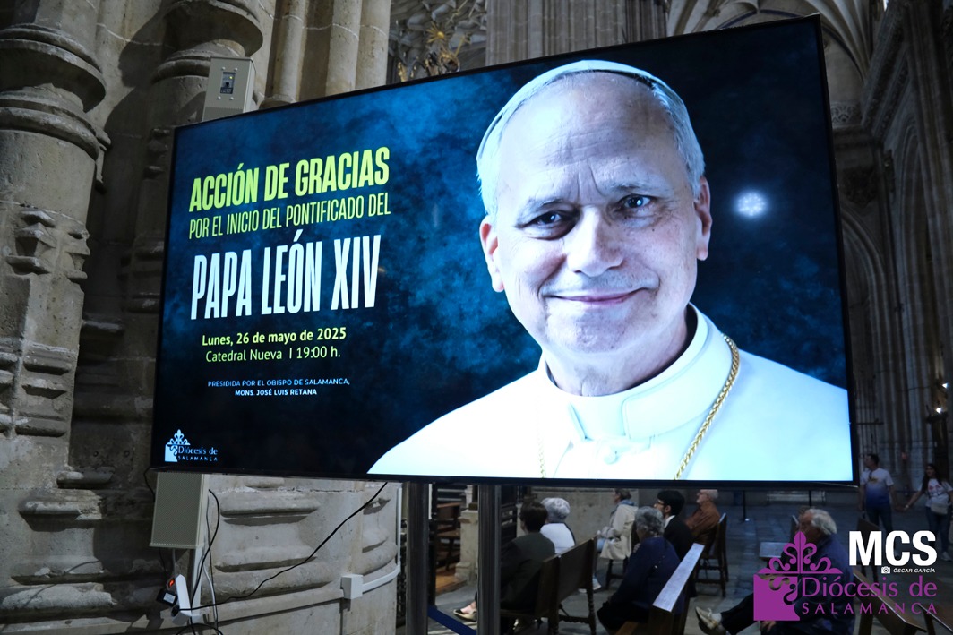 La Catedral Nueva de Salamanca acogió ayer una emotiva e histórica celebración eucarística para dar gracias a Dios por el inicio del pontificado de León XIV, el nuevo sucesor de Pedro. La misa, presidida por el obispo, Mons. José Luis Retana, reunió a un gran número de fieles, sacerdotes de la diócesis, así como miembros de la comunidad agustiniana de Salamanca, en un gesto de especial comunión con el nuevo papa, también agustino.