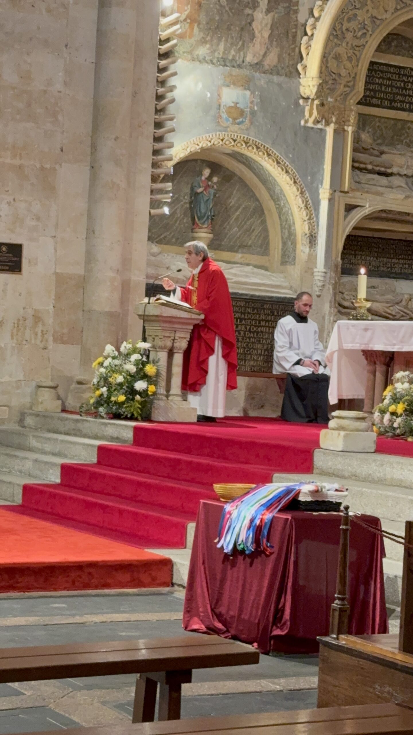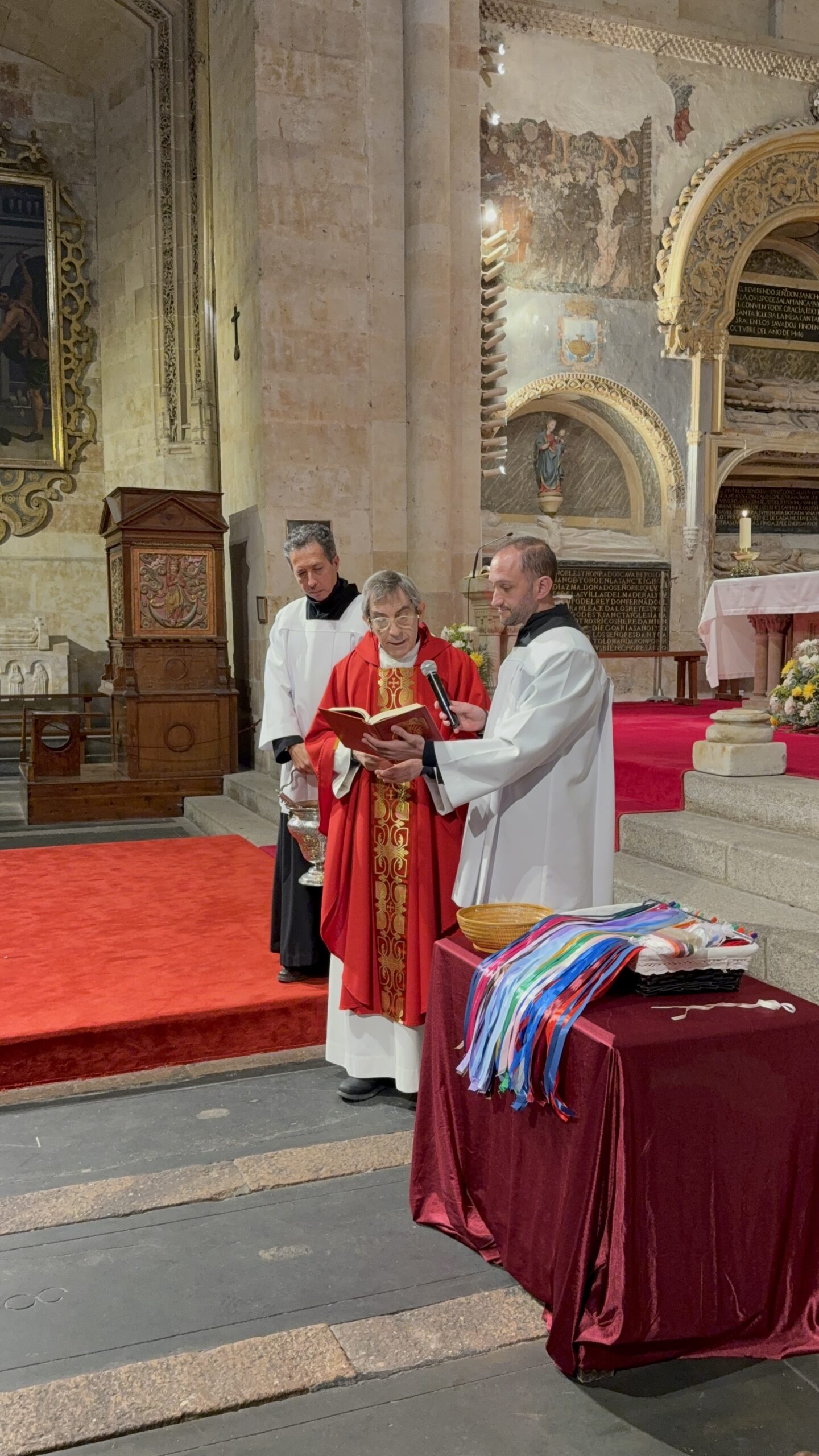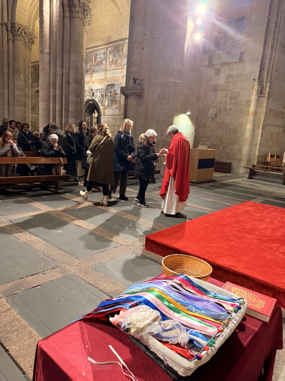 La devoción traspasa fronteras. Susy, llegada desde Argentina, aprovechó su estancia en Salamanca para participar en la eucaristía y llevar las gargantillas bendecidas a los estudiantes latinoamericanos con los que trabaja estos días, prolongando así la celebración más allá de la catedral.