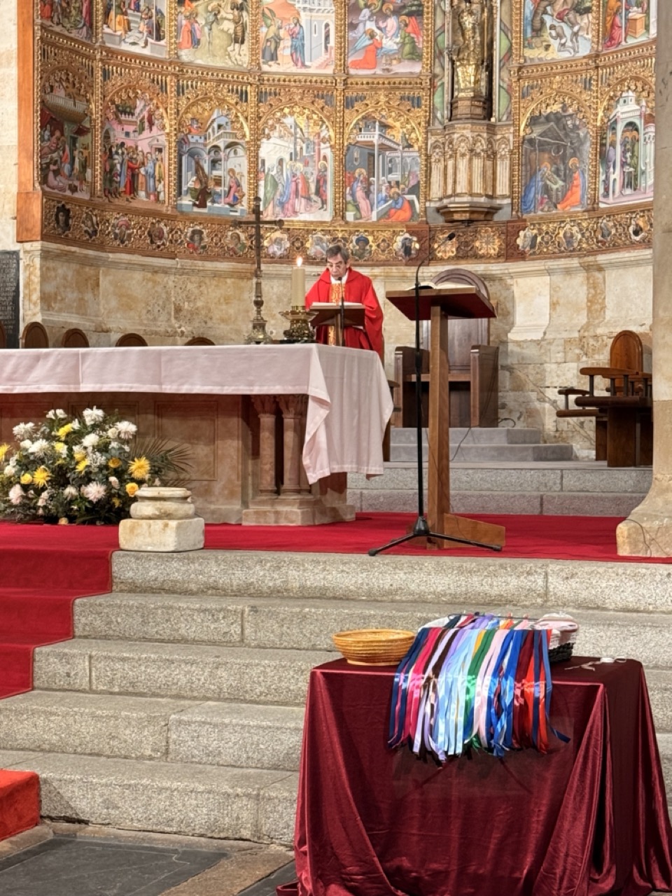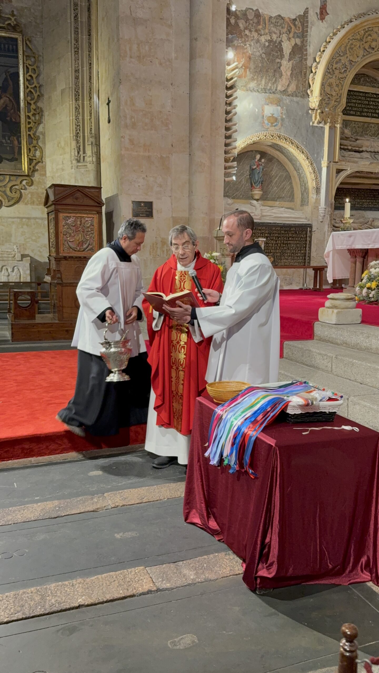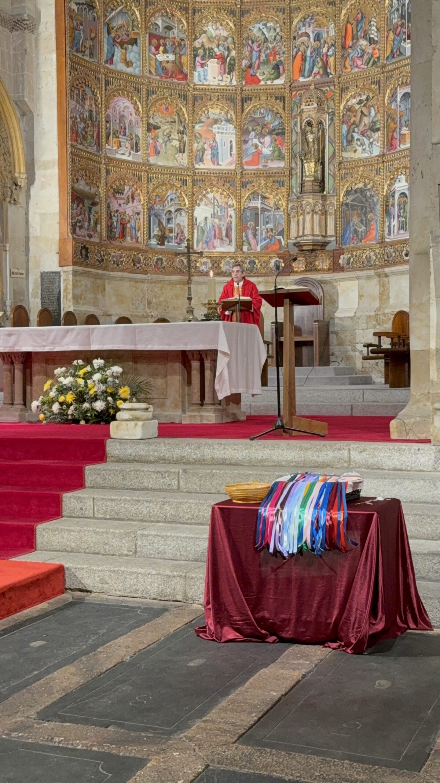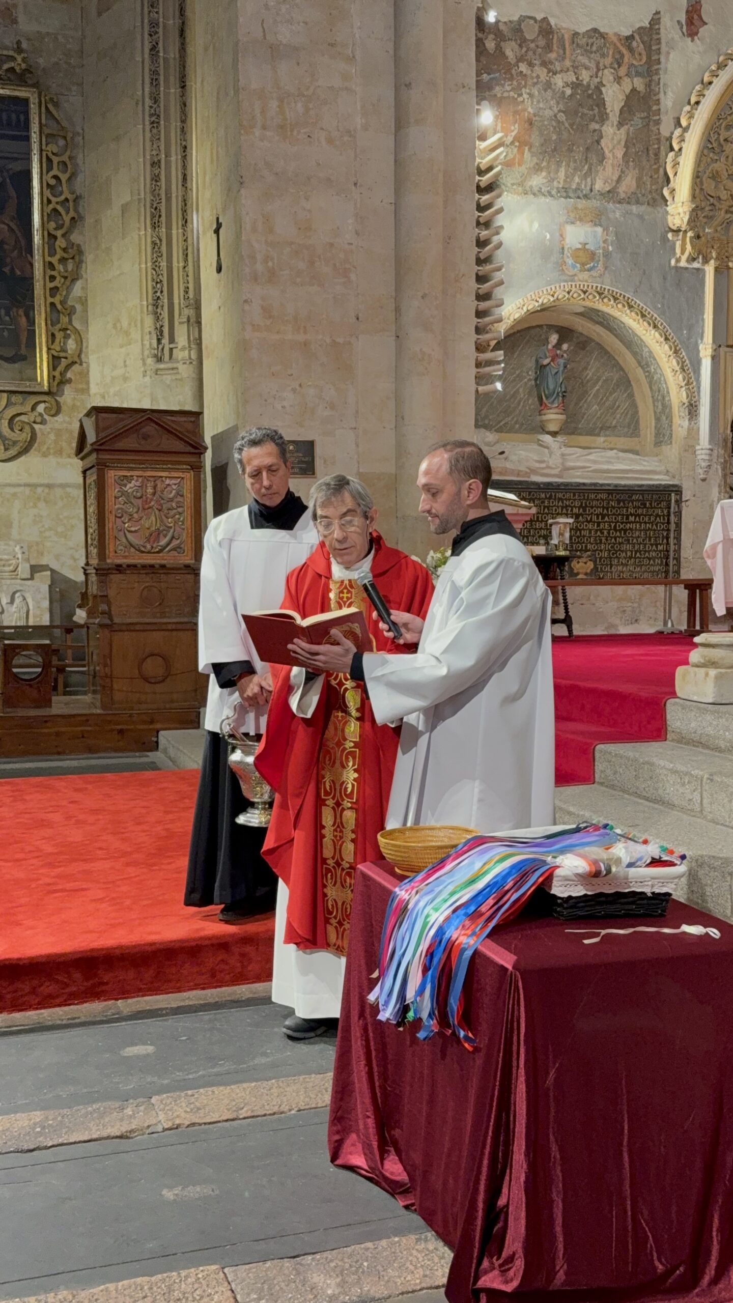 La devoción traspasa fronteras. Susy, llegada desde Argentina, aprovechó su estancia en Salamanca para participar en la eucaristía y llevar las gargantillas bendecidas a los estudiantes latinoamericanos con los que trabaja estos días, prolongando así la celebración más allá de la catedral.