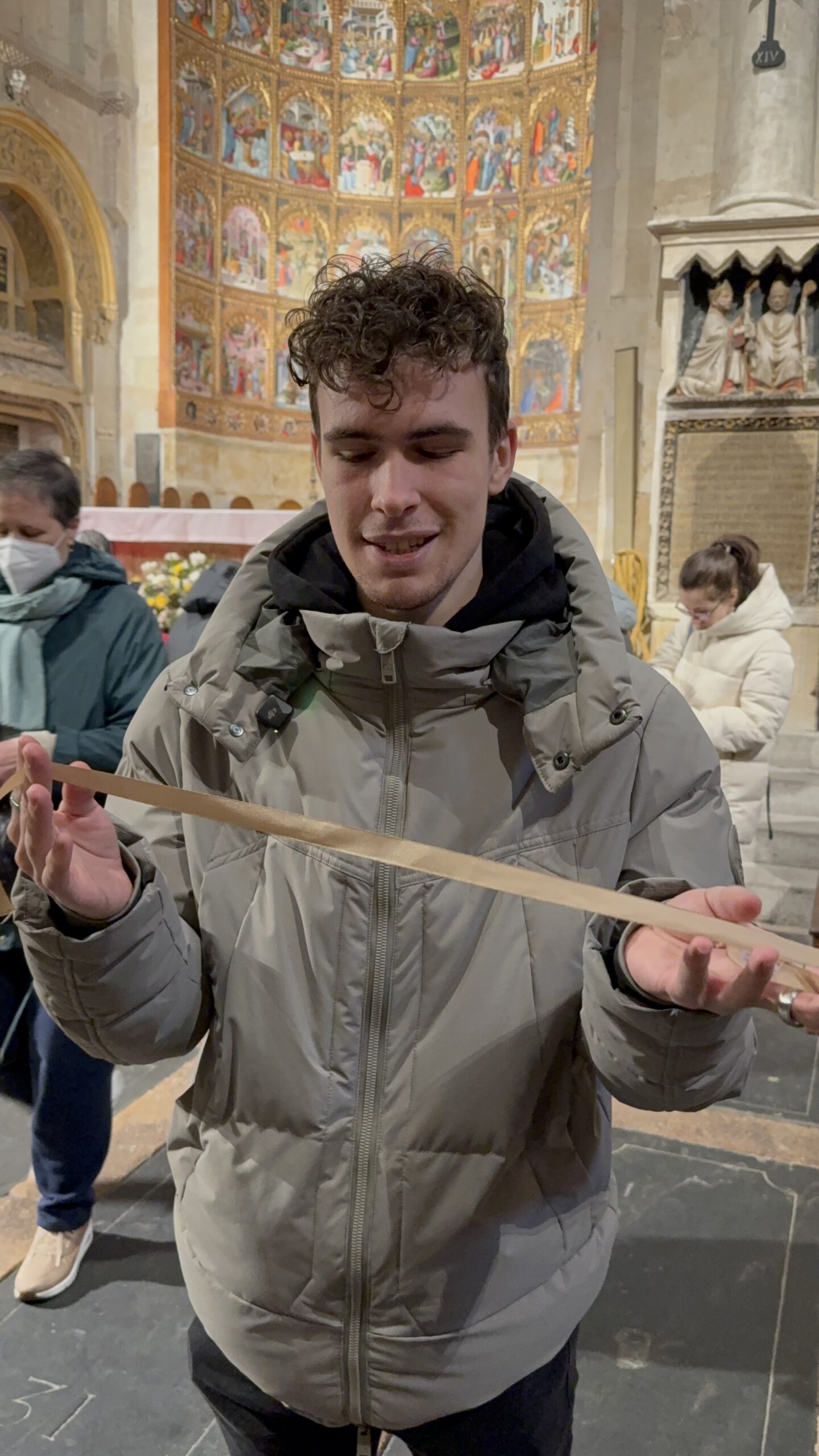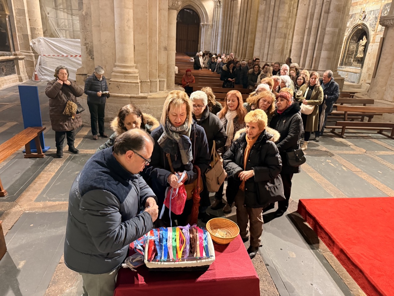 Para Sergio, asistir cada año a la misa de San Blas es una costumbre familiar que se mantiene viva. “Para protegernos de una gripe o un catarro, nos viene bien”, comenta. Tras finalizar la eucaristía y la bendición, una larga fila se formó en el templo para recoger las gargantillas de colores que iba repartiendo el personal de la Catedral. La tradición marca que tiene que llevarse puesta en el cuello hasta el Miércoles de Ceniza, cuando hay que quemarla.