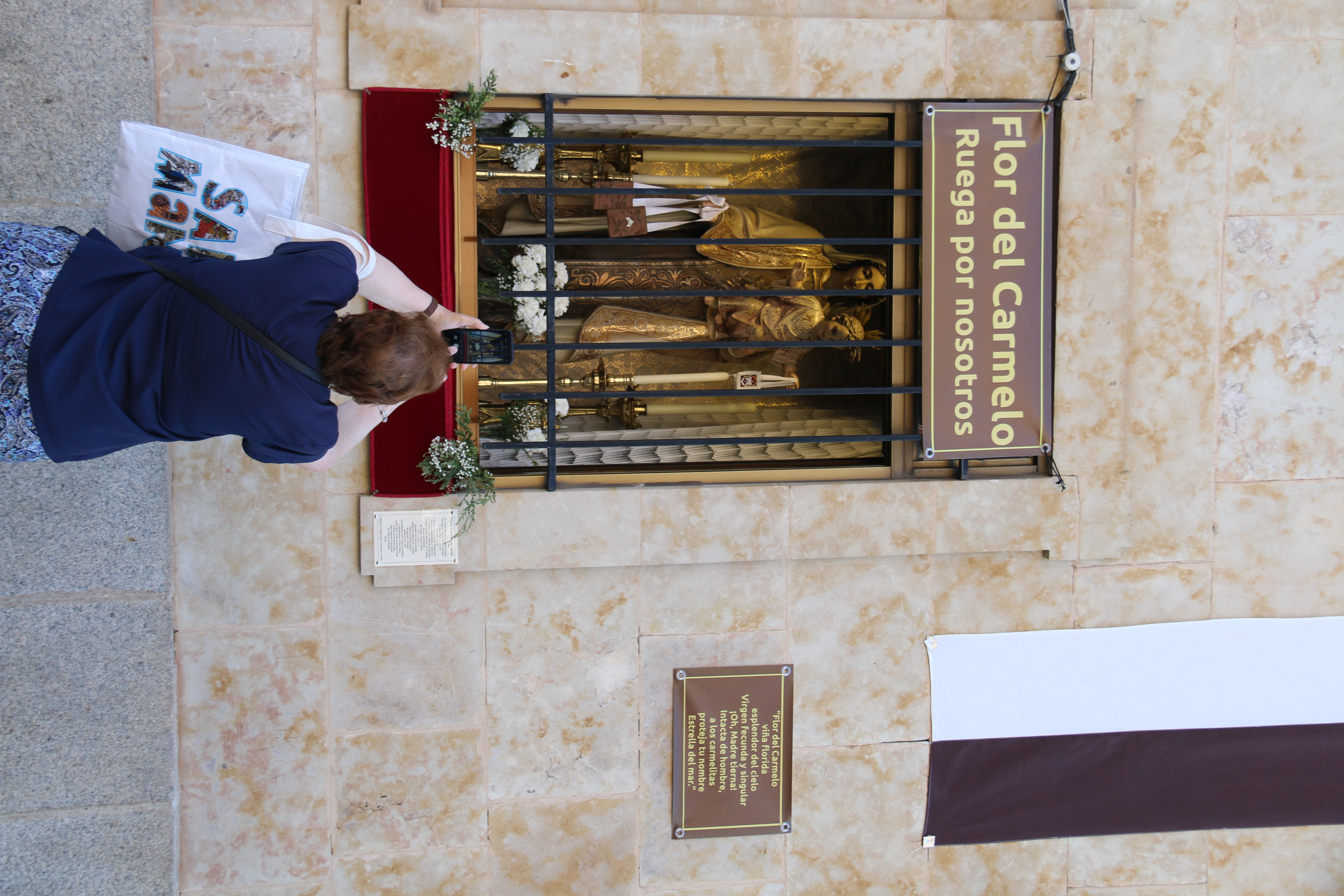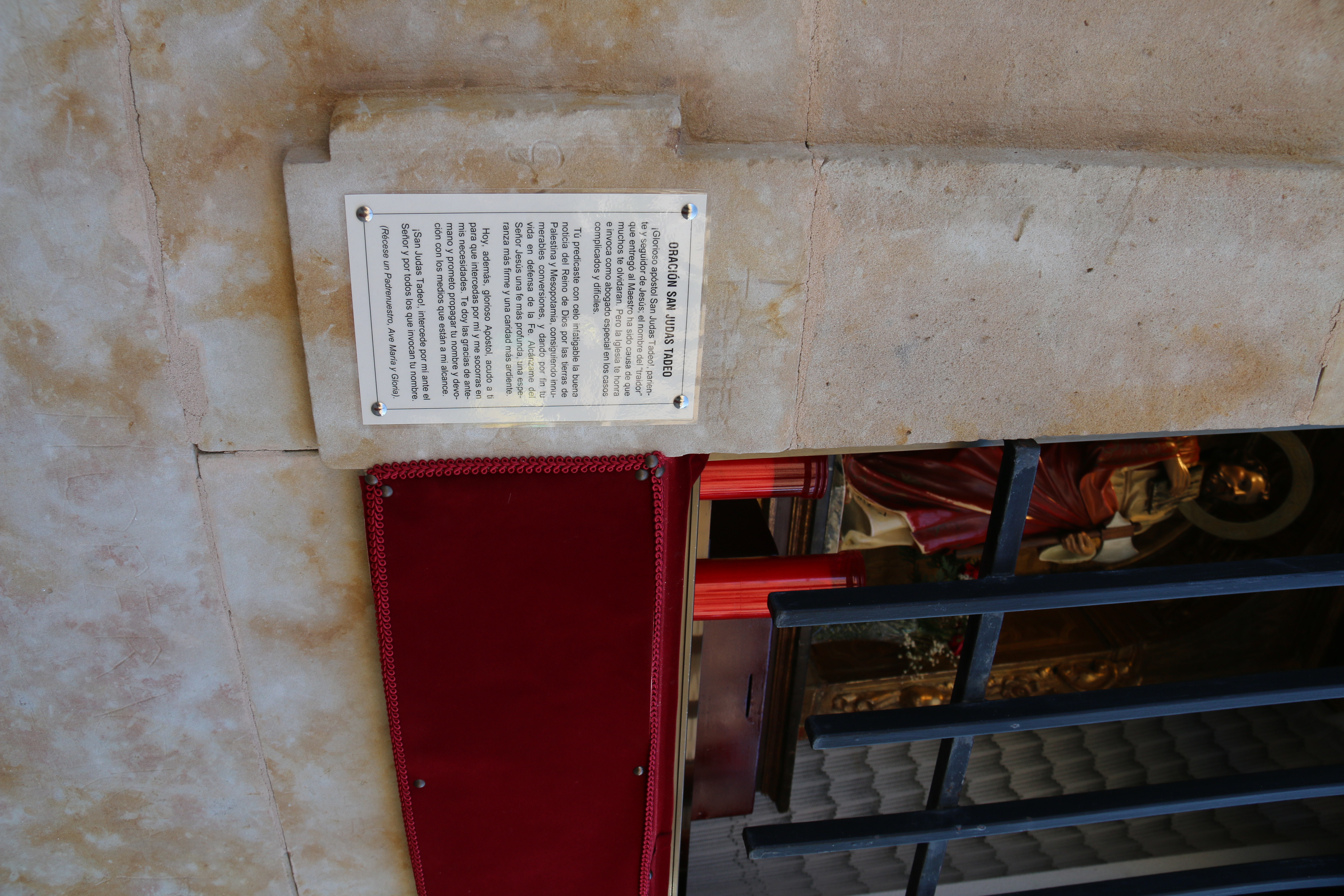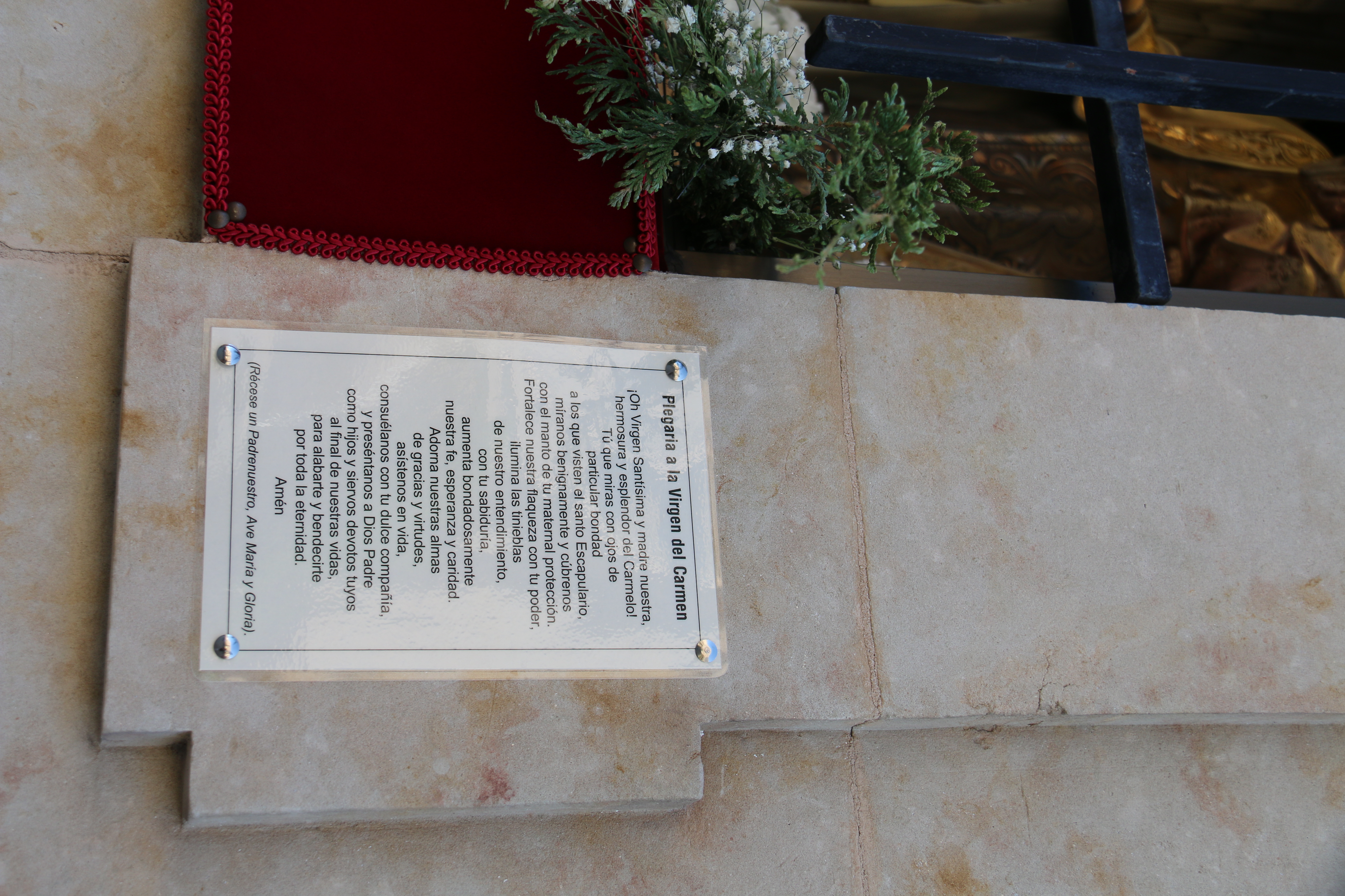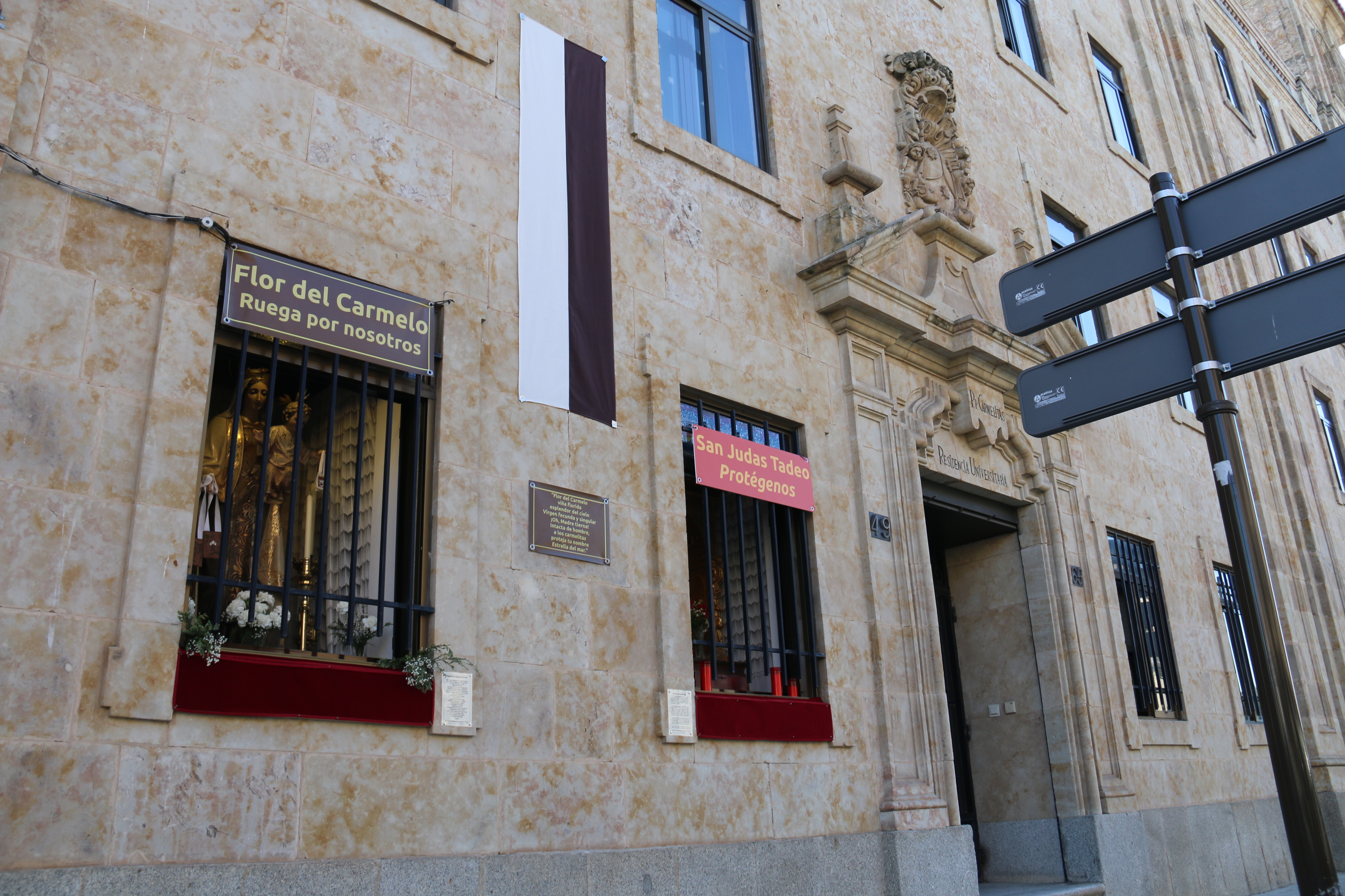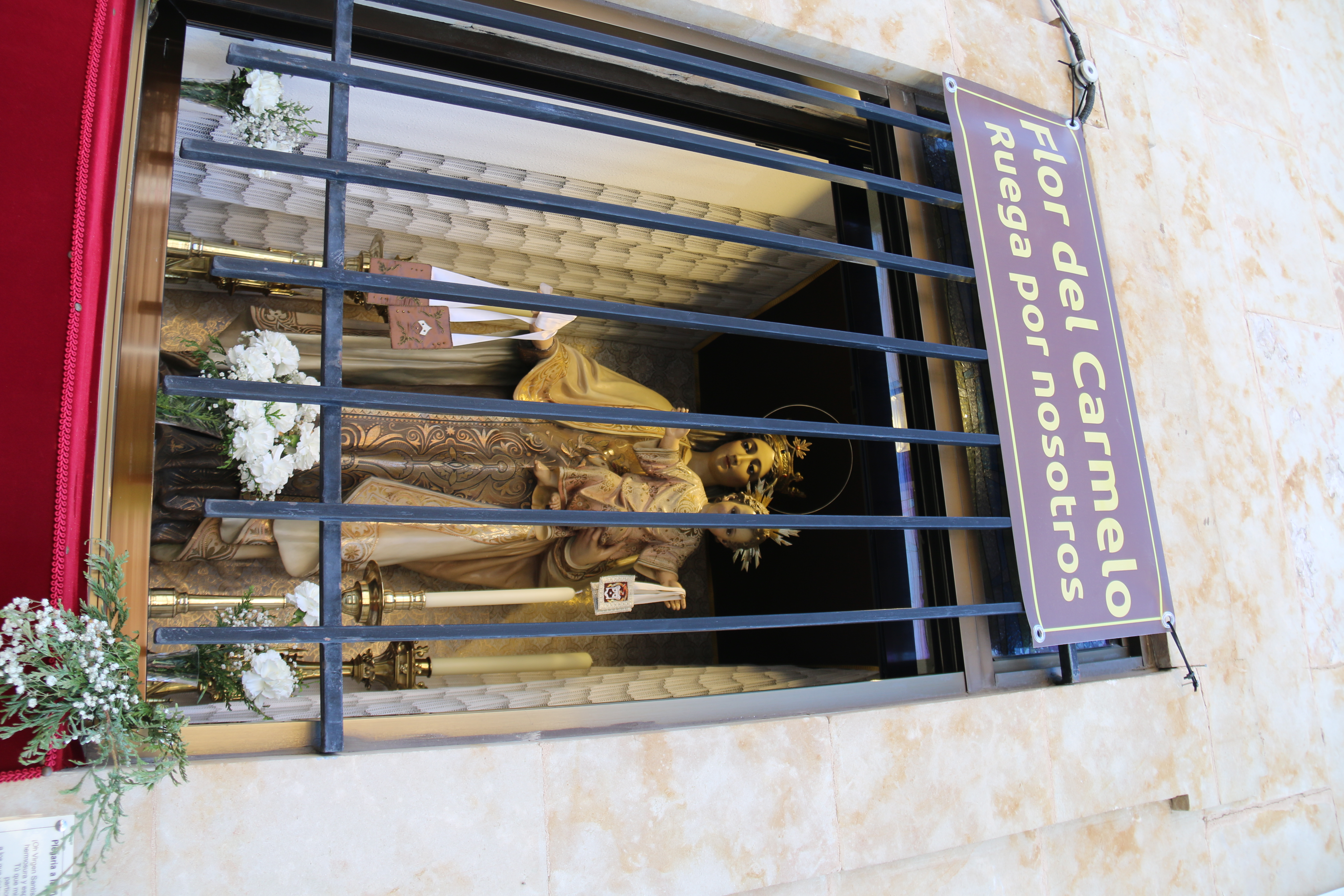 Junto a la ventana de cada imagen también se han colocado sus oraciones. Por un lado, la plegaria de la Virgen del Carmen, y sobre el dintel una lona donde se puede leer: “Flor del Carmelo, ruega por nosotros“. Y lo mismo sucede con San Judas Tadeo, con su oración y una lona con una petición: “San Judas Tadeo, protégenos”.