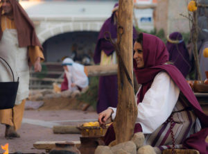 Muchas de las antigüedades que se muestran en el belén viviente son de Mateo Arias, quien las colecciona desde que tenía 17 años. En su puesto recrea una panadería de hace dos mil años, “con utensilios y herramientas lo más antiguas posibles”. De hecho, como detalla, cuenta con un molino de piedra para simular cómo se molía el trigo. “Lo importante de este belén es que nos une a todos”, argumenta. Además, insiste en que siempre se ciñen al texto bíblico, “que se va narrando acompañado de música”. Arias también detalla que, tras el nacimiento del Niño Jesús, todos los oficios que se presentan en la Plaza Mayor ofrecen algo en el portal, para cerrar con los tres Reyes Magos.