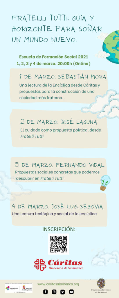“Fratelli Tutti: guía para soñar un mundo nuevo”, es el lema de la XXXVI Escuela de Formación Social (EFS) que promueve Cáritas diocesana de Salamanca y que por primera vez se va a llevar a cabo en formato online, del 1 al 4 de marzo, a las 20.00 horas desde la plataforma de formación Zoom.