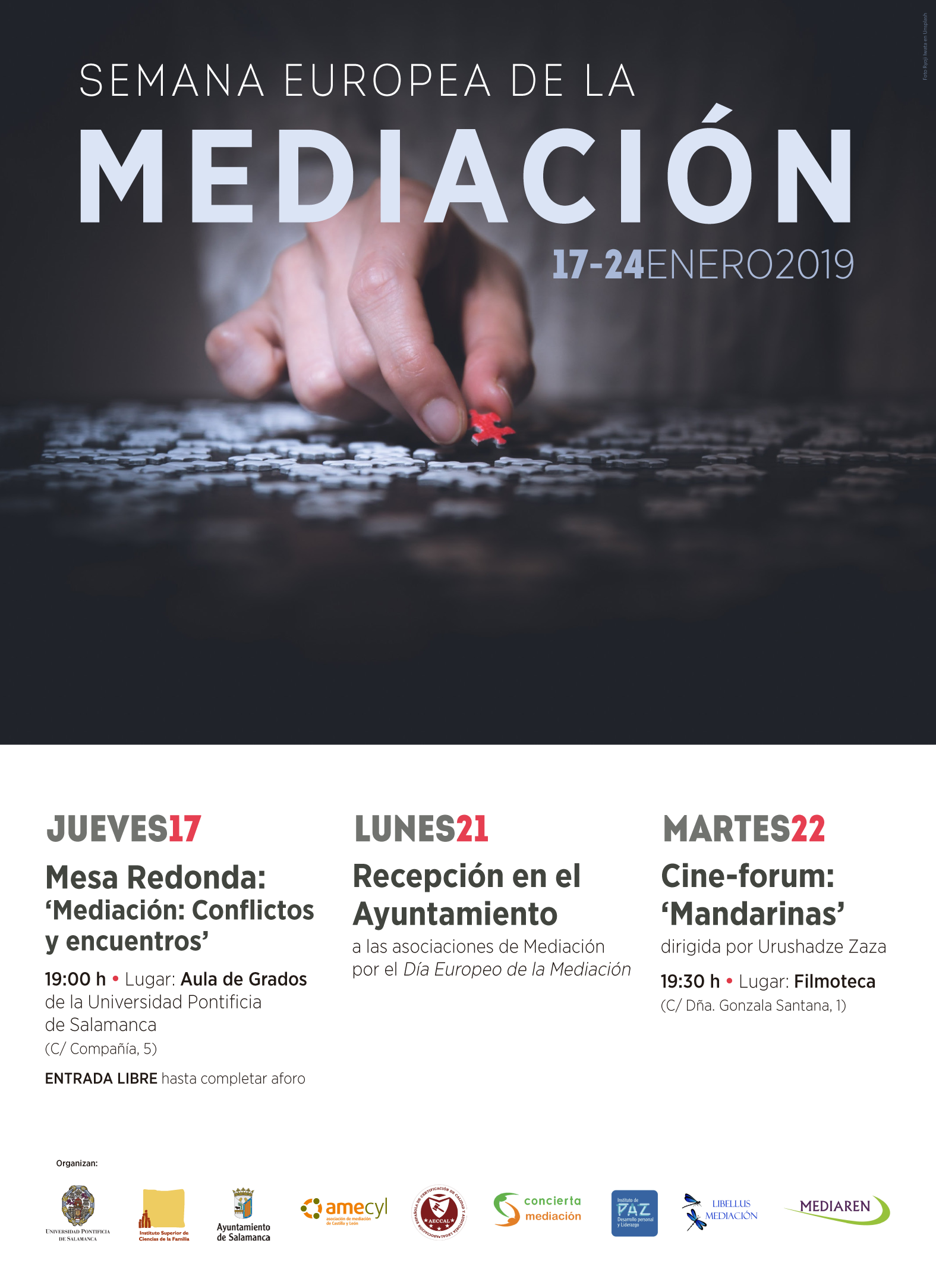 El Instituto de Ciencias de la Familia de la UPSA organiza conjuntamente con la Concejalía de Familia e Igualdad de Oportunidades del Ayuntamiento de Salamanca, y con seis asociaciones especializadas (AMECYL, AECCAL, Concierta Mediación, Instituto de Paz, Libellus Mediación y Mediaren), la Semana Europea de la Mediación.