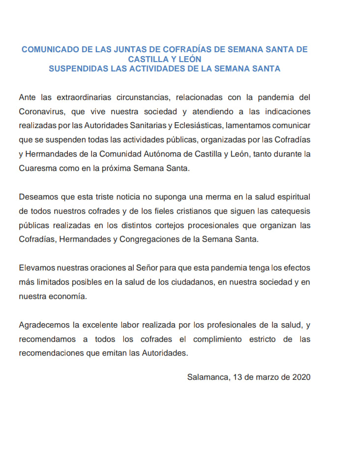 La decisión se ha dado a conocer a través de un comunicado conjunto de las juntas de cofradías de Castilla y León