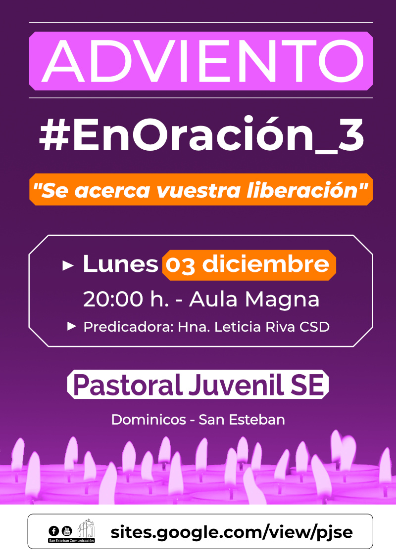 Bajo el lema: “Se acerca vuestra liberación”, el lunes 3 de Diciembre se va a celebrar el tercer encuentro #EnOración que organiza la Pastoral Juvenil del Convento de San Esteban de Salamanca. Predicará la Hermana Leticia Riva, CSD, directora de residencia universitaria (Santa Rosa de Lima)