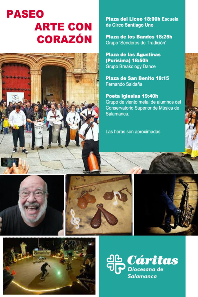 Los actos continuarán la víspera del Corpus, el sábado 5 de junio, a las 17:30 de la tarde, en la Plaza Mayor de Salamanca donde está previsto crear el logo de Cáritas con la colaboración de todos. Media hora después dará comienzo en la Plaza del Liceo el “Paseo Arte con Corazón”, que transcurrirá por el centro de la ciudad y en el que van a participar la Escuela de Circo Santiago Uno, los grupos “Senderos de Tradición” y “Breakology Dance”, el humorista Fernando Saldaña y el grupo de alumnos de viento-metal del Conservatorio Superior de Música de Salamanca.