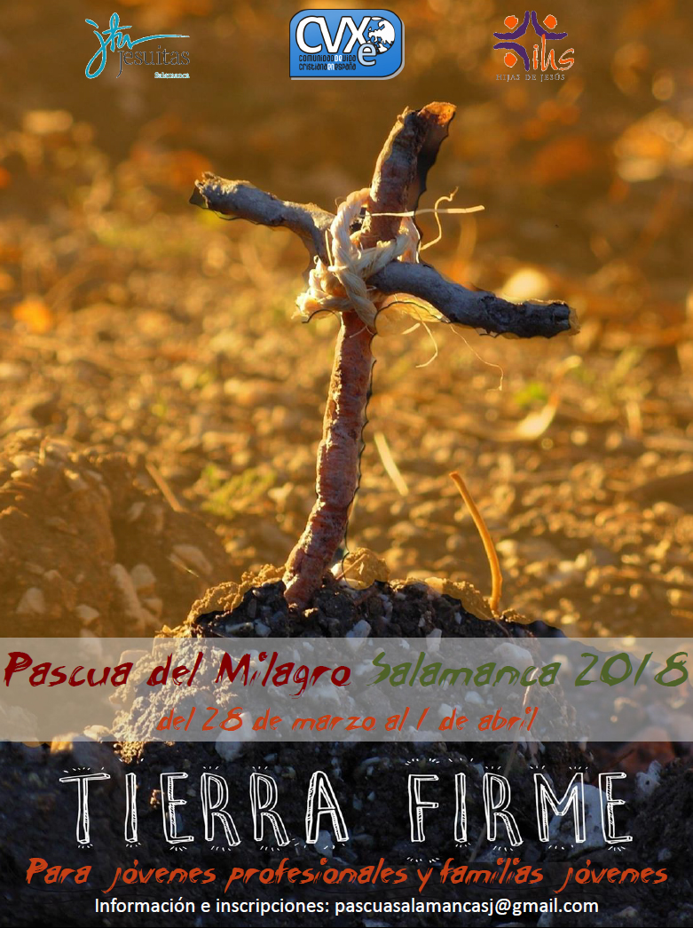 Las comunidades de Jesuitas e Hijas de Jesús de Salamanca junto a CVX España organizan, del 28 de marzo al 1 de abril, la Pascua del Milagro 2018, este año bajo el lema: “Tierra firme”. La actividad se va a celebrar en el Centro de Espiritualidad de los Jesuitas de Salamanca y está dirigida a jóvenes profesionales y familias jóvenes (con o sin hijos), hasta 45 años, que desean tener un espacio para la convivencia, la oración y la celebración intensa de los días que dan sentido a la fe de los cristianos.
