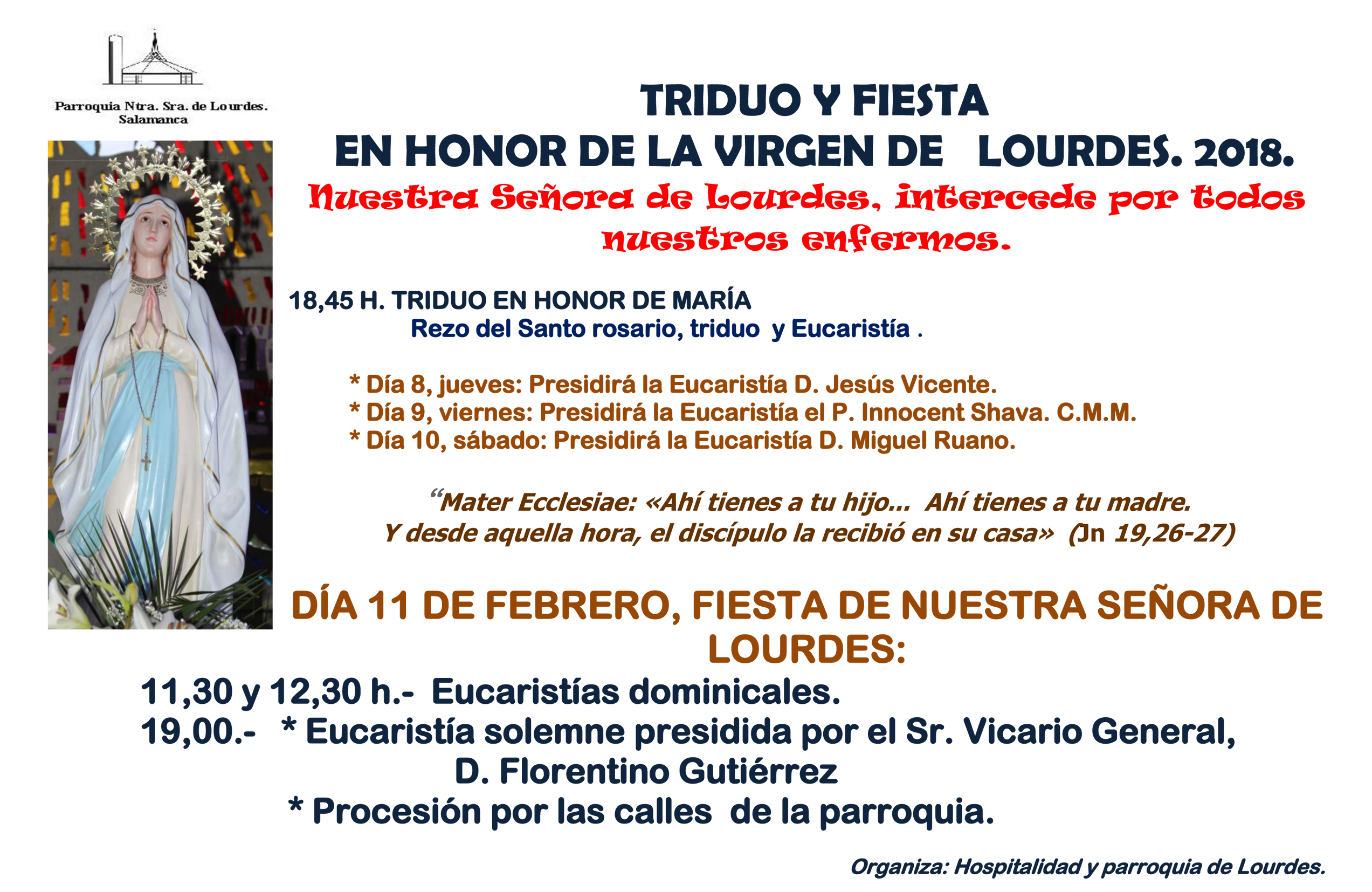 Del 8 al 10 de febrero tendrá lugar un triduo en Honor de María que tendrá lugar a las 18:45 h en la parroquia de Ntra. Sra. de Lourdes. El domingo, 11 de febrero, con motivo de la Festividad de Ntra. Sra. de Lourdes se va a celebrar una Eucaristía solemne, presidida por el Vicario General de la Diócesis, D. Florentino Gutiérrez a las 19:00 h en dicha parroquia seguida de la procesión por las calles de la parroquia.