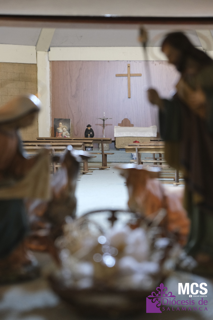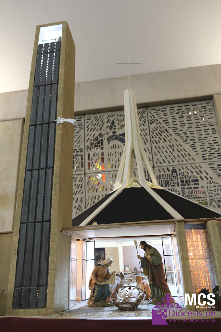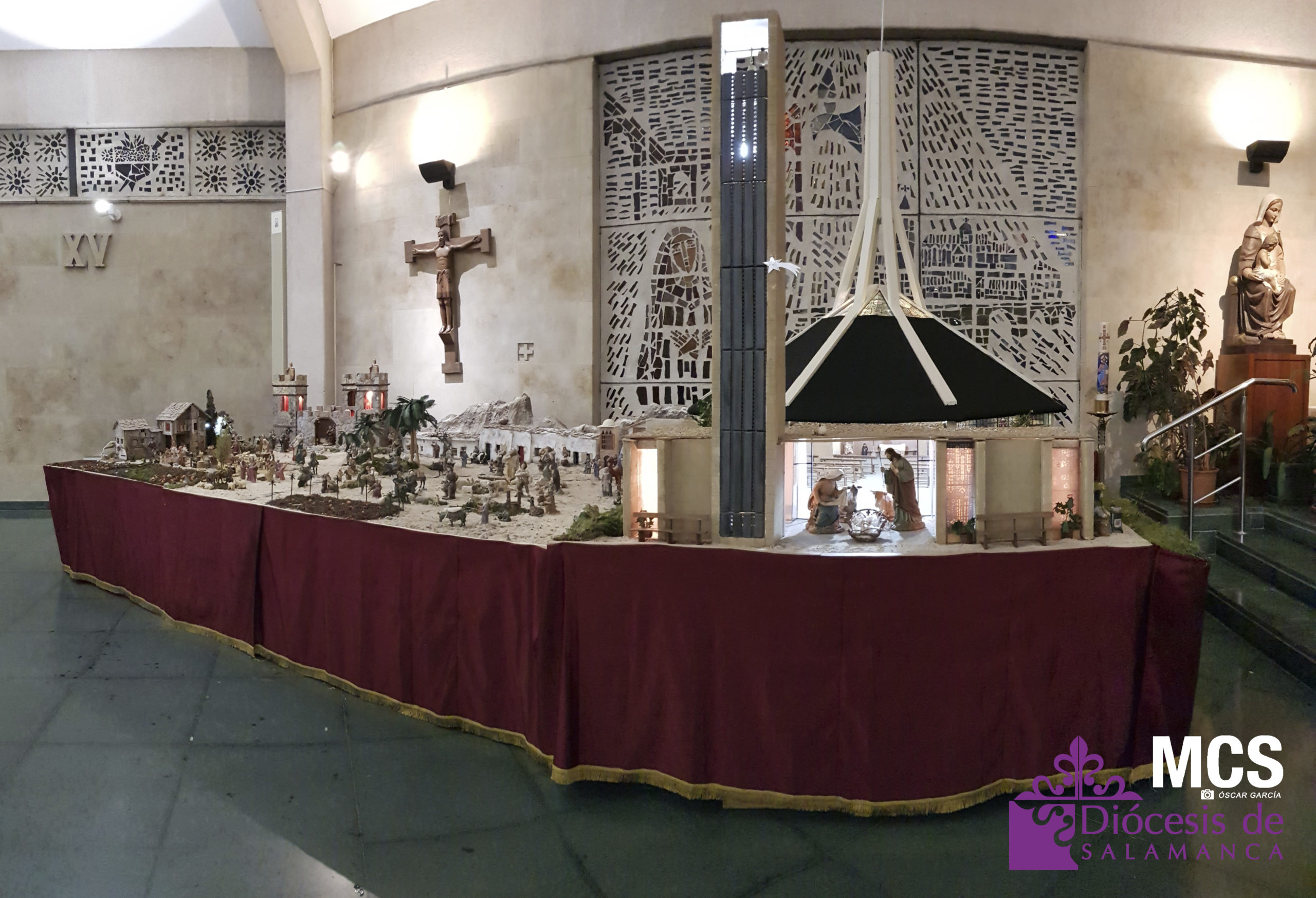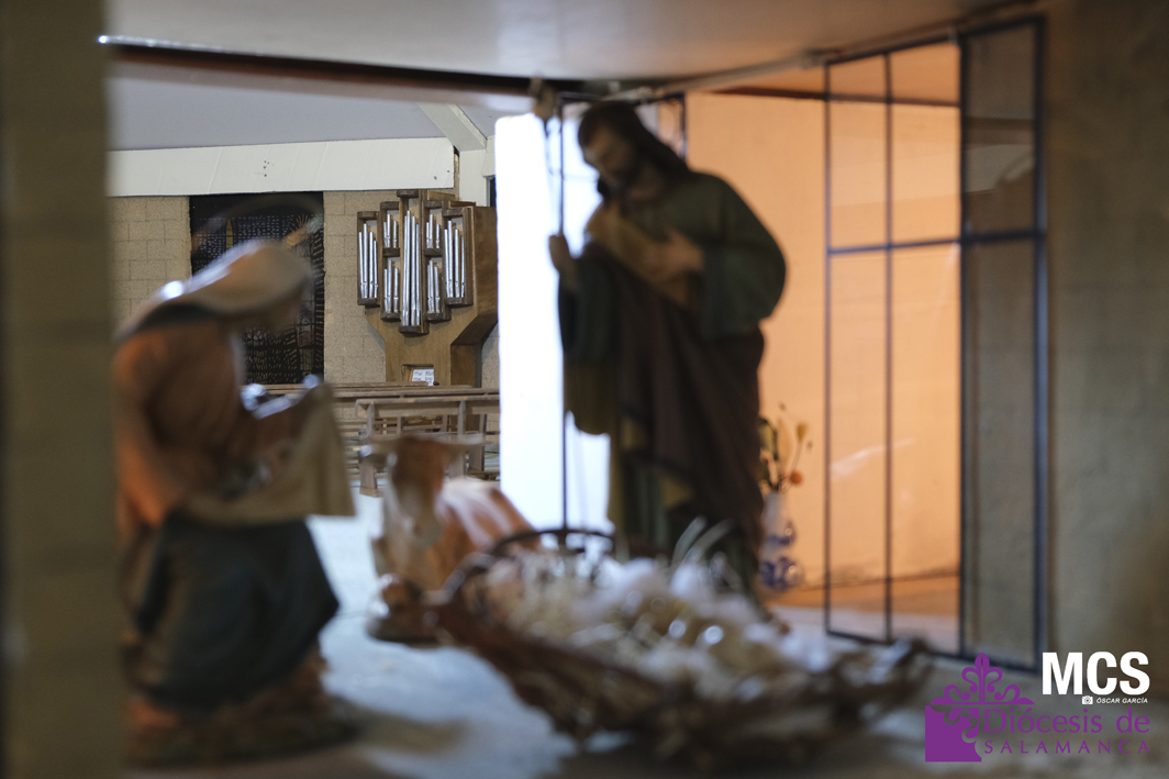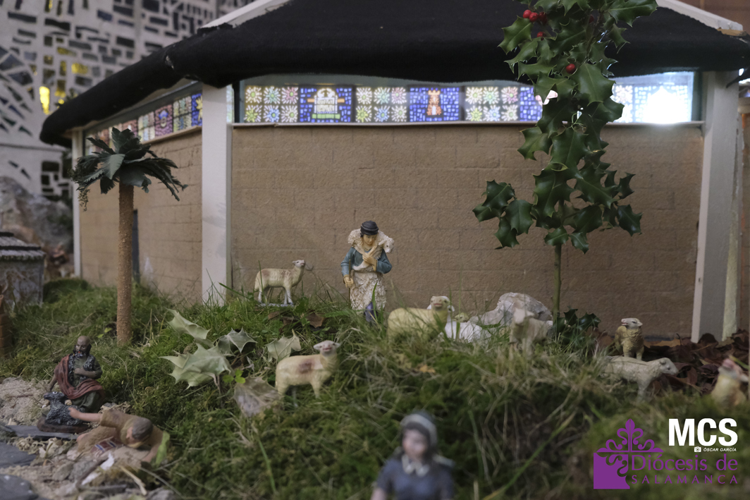 Lo más llamativo del belén de la parroquia de Lourdes, en el barrio salmantino de Capuchinos, es la maqueta de la iglesia que sirve de pesebre para el nacimiento de Jesús. En su interior, se puede apreciar cada detalle de la misma, desde los bancos, las imágenes, el órgano o las vidrieras. Según relata Fátima Macho, “se imprimieron en plástico después de hacer unas fotografías”.