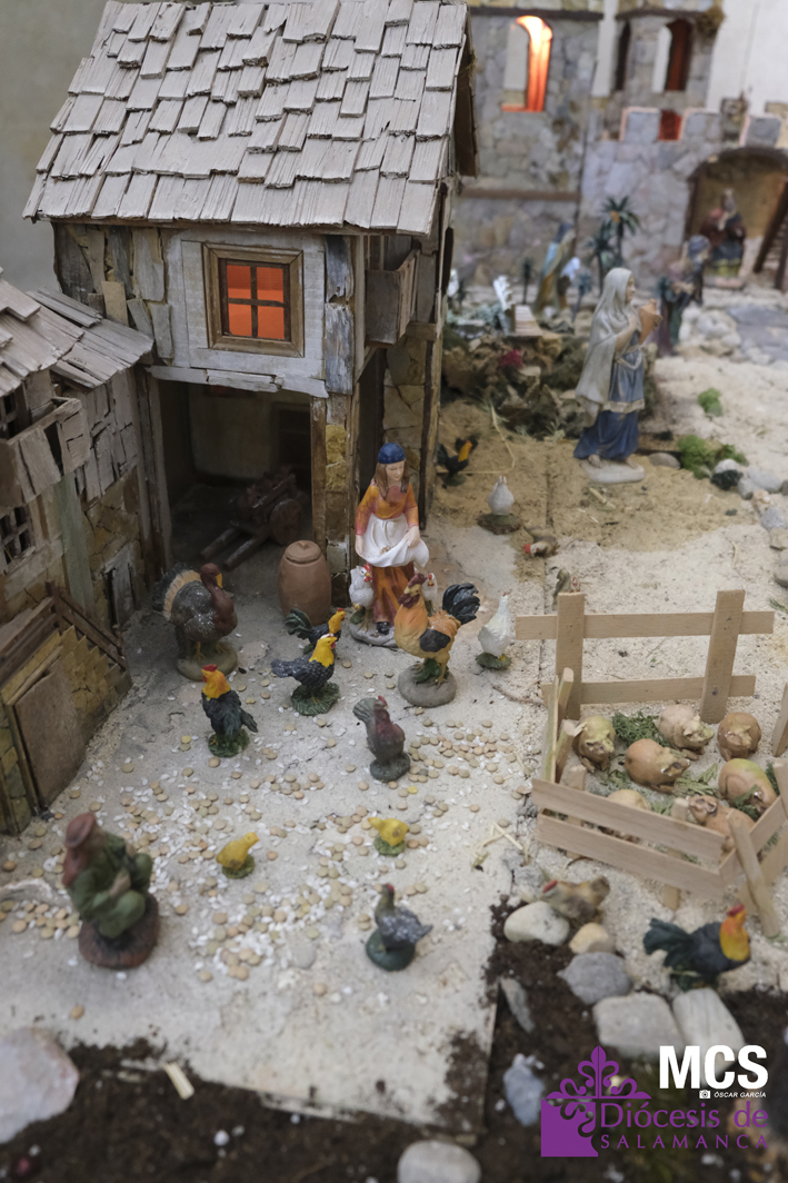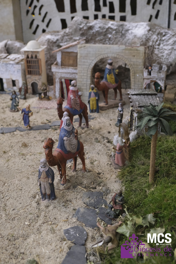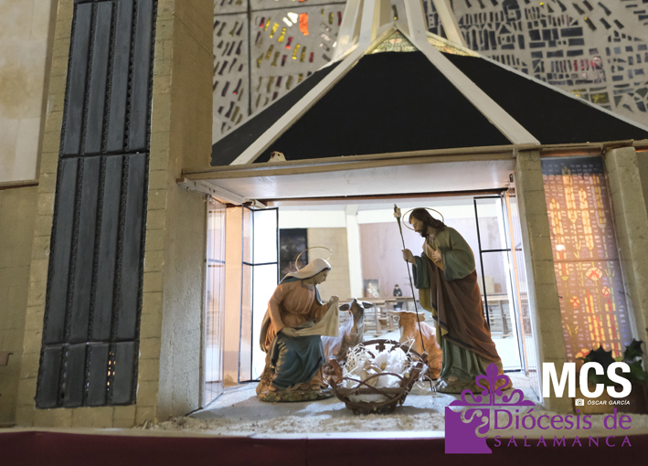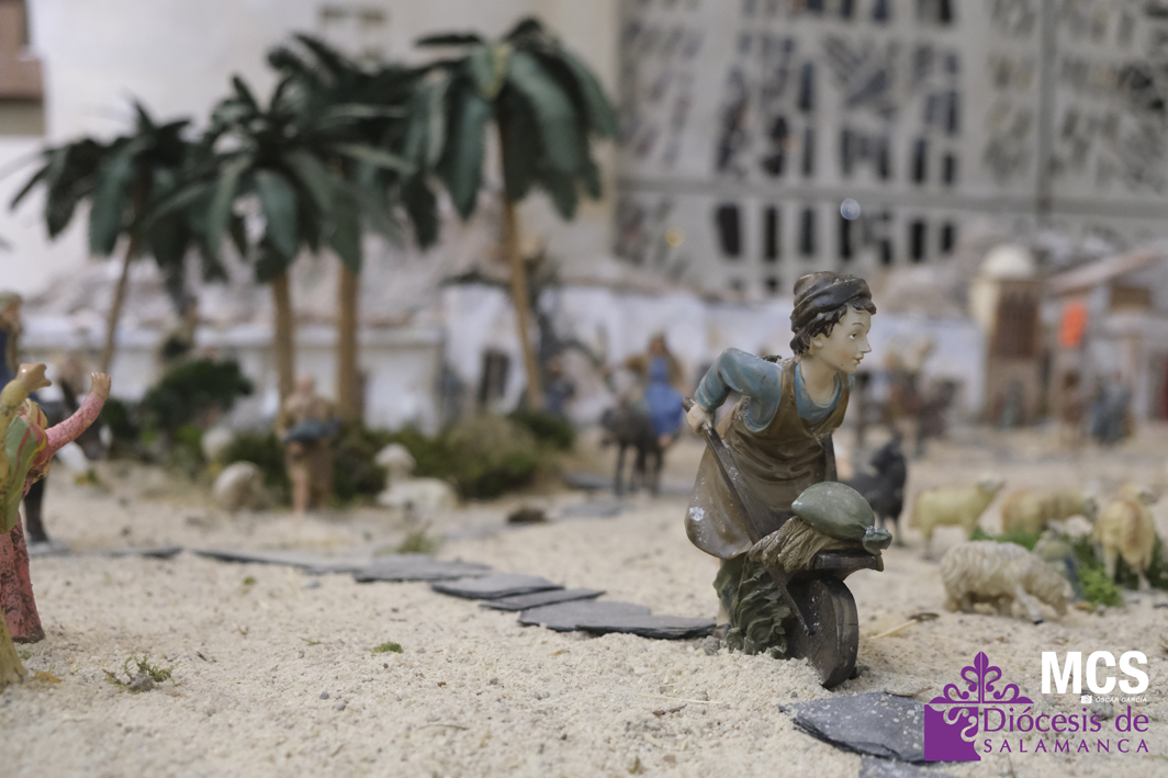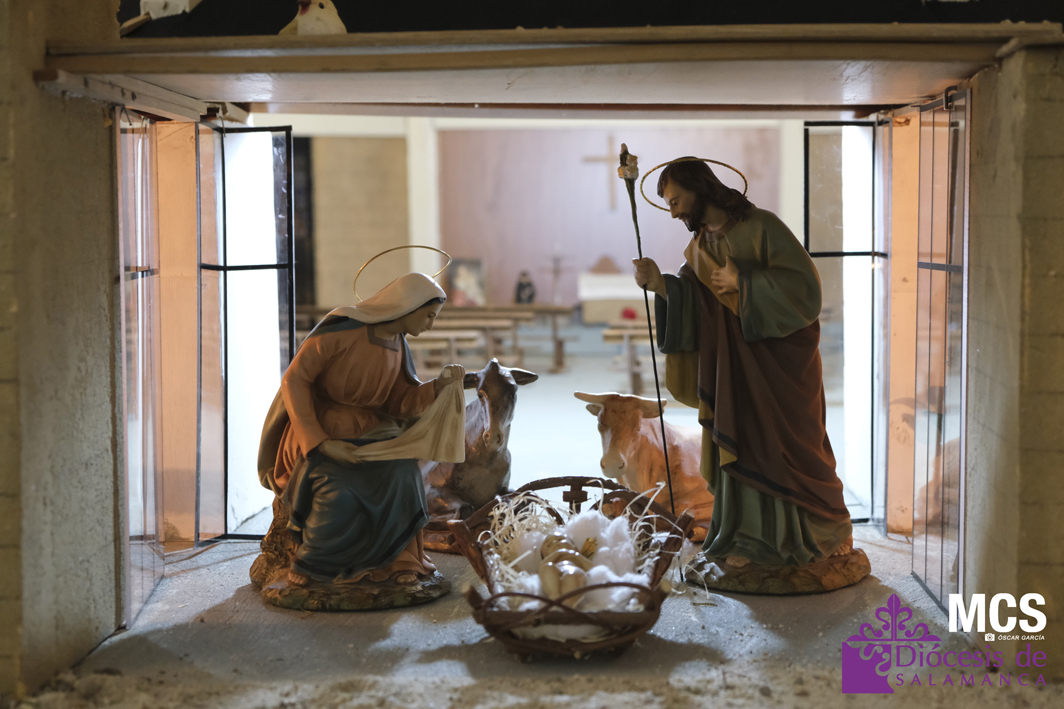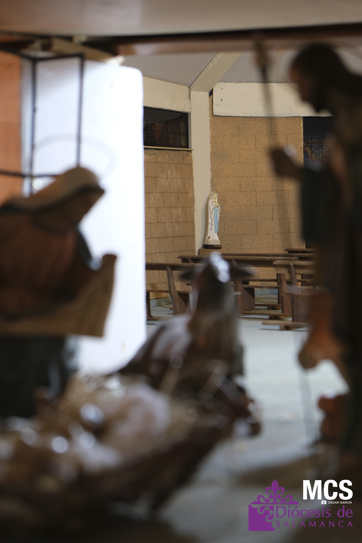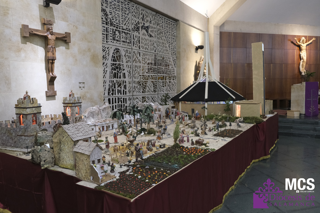 Lo más llamativo del belén de la parroquia de Lourdes, en el barrio salmantino de Capuchinos, es la maqueta de la iglesia que sirve de pesebre para el nacimiento de Jesús. En su interior, se puede apreciar cada detalle de la misma, desde los bancos, las imágenes, el órgano o las vidrieras. Según relata Fátima Macho, “se imprimieron en plástico después de hacer unas fotografías”.