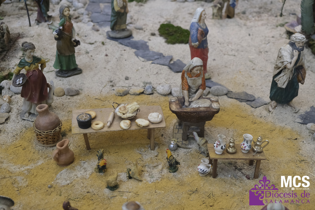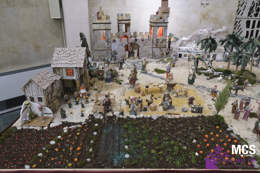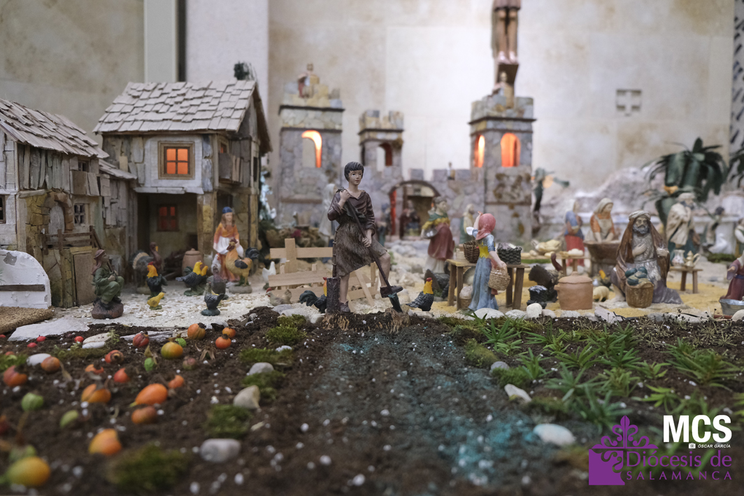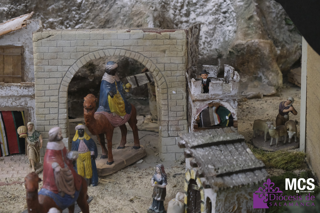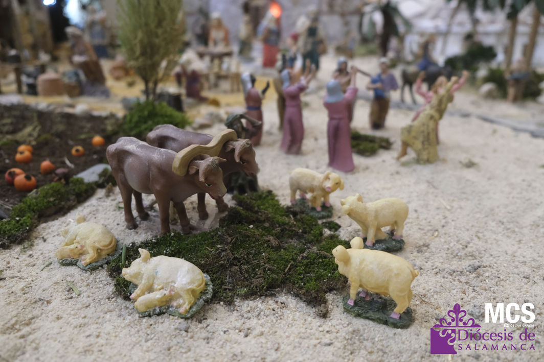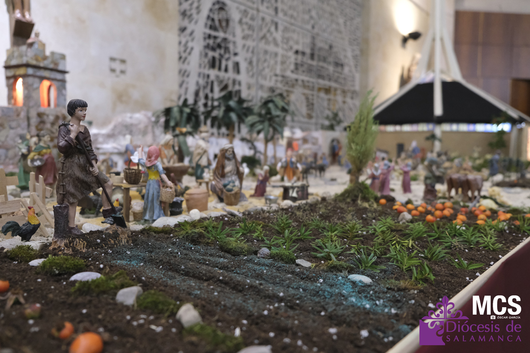 Lo más llamativo del belén de la parroquia de Lourdes, en el barrio salmantino de Capuchinos, es la maqueta de la iglesia que sirve de pesebre para el nacimiento de Jesús. En su interior, se puede apreciar cada detalle de la misma, desde los bancos, las imágenes, el órgano o las vidrieras. Según relata Fátima Macho, “se imprimieron en plástico después de hacer unas fotografías”.