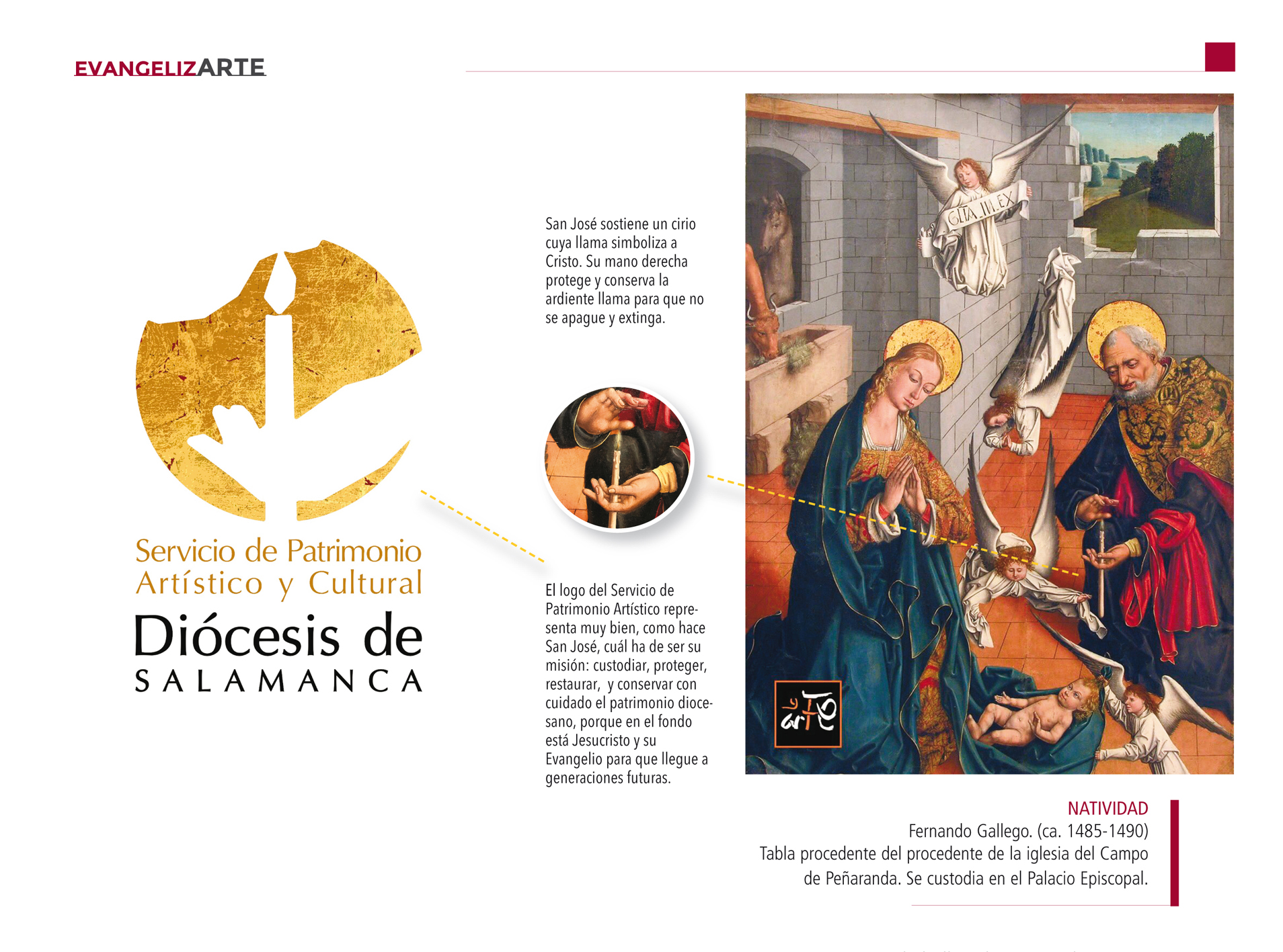 No es tan fácil acertar con un logo que conecte y sea artístico, había que ponerse en manos de alguien formado, que sepa hacerlos y capte lo que es la belleza cristiana. Nos acordamos del sacerdote reparador Ángel Alindado Hernández, sus trabajos de creación y maquetación en exposiciones, en publicaciones y en las redes sociales siempre nos habían gustado y llamado la atención. A pesar de sus muchas tareas, sacó tiempo para atendernos gratuitamente, algo que le agradecemos sinceramente desde nuestra diócesis. Como buen profesional nos preguntó al principio qué era lo que queríamos que el logo fuera a transmitir a través de su formas, y si teníamos alguna obra artística que nos sirviera de inspiración. Precisamente nos fijamos en un detalle de una tabla pintada por Fernando Gallego, se trata de la Natividad, realizada entre 1485 y 1490, procedente de la Parroquia de El Campo de Peñaranda, conservada y enseñada desde hace muchos años en la exposición permanente del Palacio Episcopal. Si nos fijamos bien en las manos de San José, están trazadas dentro de una circunferencia, cuyo centro es la luz de una llama, símbolo de Cristo. La mano izquierda toma delicadamente por debajo la vela y, por encima, la derecha protege y conserva la llama ardiente para que no se apague y extinga.