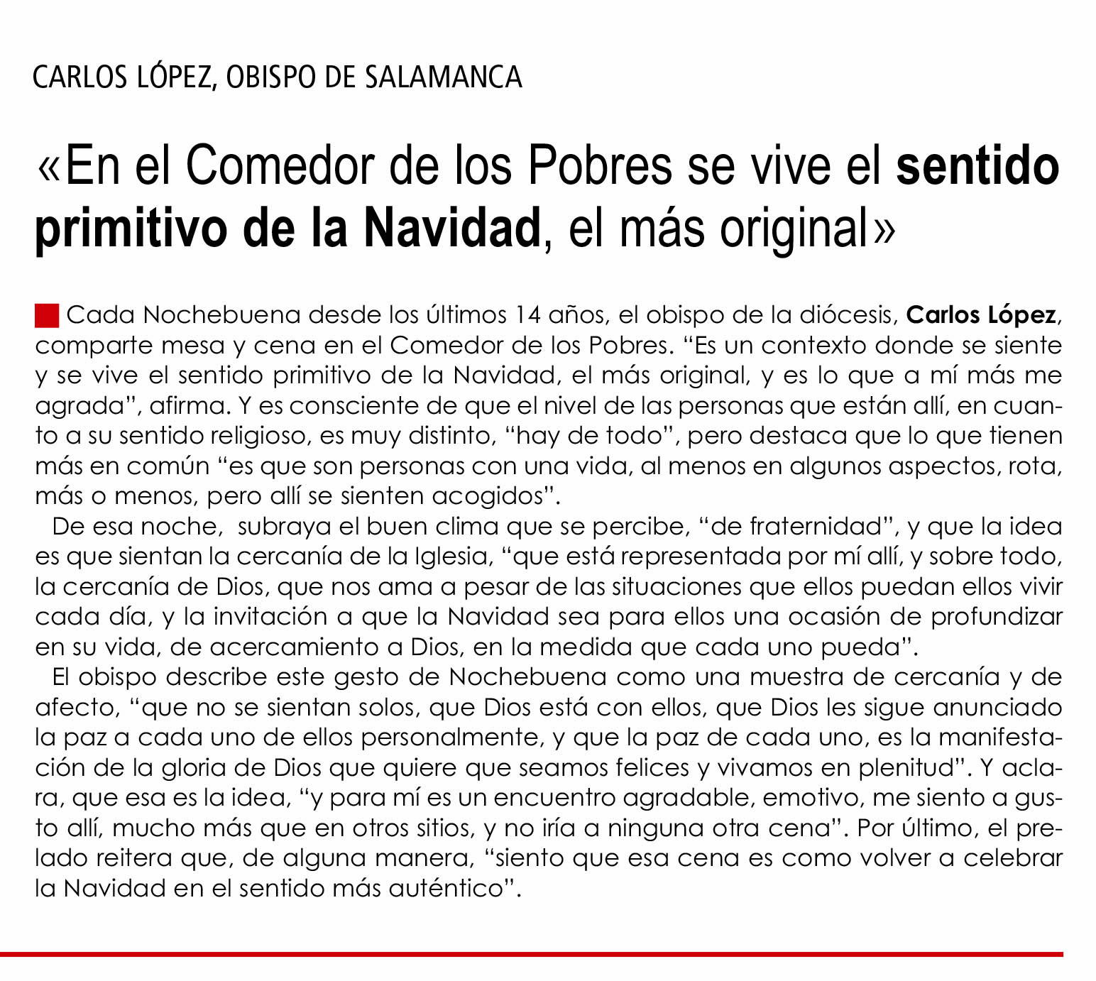 Cada Nochebuena, y gracias a la labor de los voluntarios, en el Comedor de los Pobres se organiza una cena especial, a la que suelen asistir una media de 120 personas. “Ponemos una mesa enorme, con el Niño Dios en el medio, y unas velas, para recordar que no hubo sitio para él”, subraya esta responsable. Pero como ella insiste, en ese lugar hay sitio para todos, y junto a ellos, el obispo de la Diócesis de Salamanca, Carlos López, que acude a esta cita desde que llegó de pastor a la Iglesia de Salamanca.