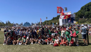 Tras vivir los Días en la Diócesis, en la zona de Aveiro, en Ouca, los 43 jóvenes que participaron se reunieron el 31 de julio en Estoril con los 69 peregrinos que venían solo a la JMJ. Ese día, previo a la inauguración de las jornadas, se celebró un encuentro de los jóvenes españoles, más de 40.000 personas, con una eucaristía y un festival de música en los jardines del Casino de Estoril, Estoril Garden. Una marea azul con camisetas en los que se podía leer: “Olá Portugal. Somos los vecinos de al lado”.