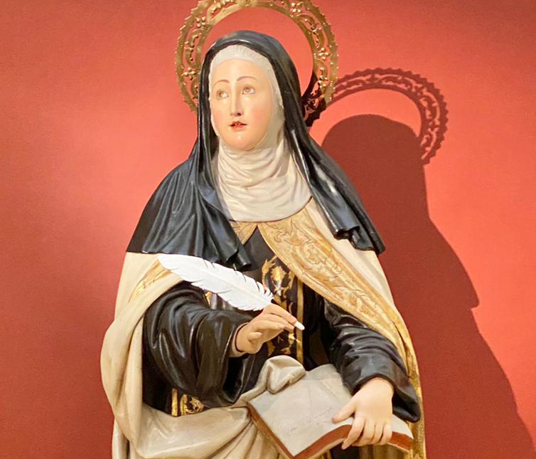 La imagen, del siglo XIX, representa a Santa Teresa de Jesús dispuesta en posición erguida, vestida con hábito carmelita y sobrepuesta una capa blanca; sujetando con su mano derecha la pluma y con la izquierda, un libro con la inscripción “Nada te turbe”. Toda ella sobre una nube plateada y peana octogonal dorada con molduras en su parte superior e inferior.