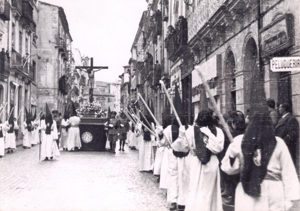La primera denominación de la hermandad fue del Santísimo Cristo de la Buena Muerte. En las crónicas de la época apuntan que desfilarán en su primera Semana Santa cien nazarenos con hábito blanco, capirotes negros y cíngulo de esparto, junto a una representación de los padres Dominicos con su ‘Schola Cantorum’. Allí estaría José Antonio Marcén, poco años después del comienzo de todo. “La procesión era un acto más de nuestra comunidad, muy solemne”, apunta. Entre sus recuerdos está el hecho de que durante la procesión entonaban: “Perdona a tu pueblo…”, (tararea este fraile dominico). Recuerda parte del recorrido de aquellos inicios de la Hermandad Dominicana: “Subíamos por San Pablo, Plaza Mayor, Rúa y bajábamos de vuelta, para llegar sobre las siete y media de la mañana”, añade.