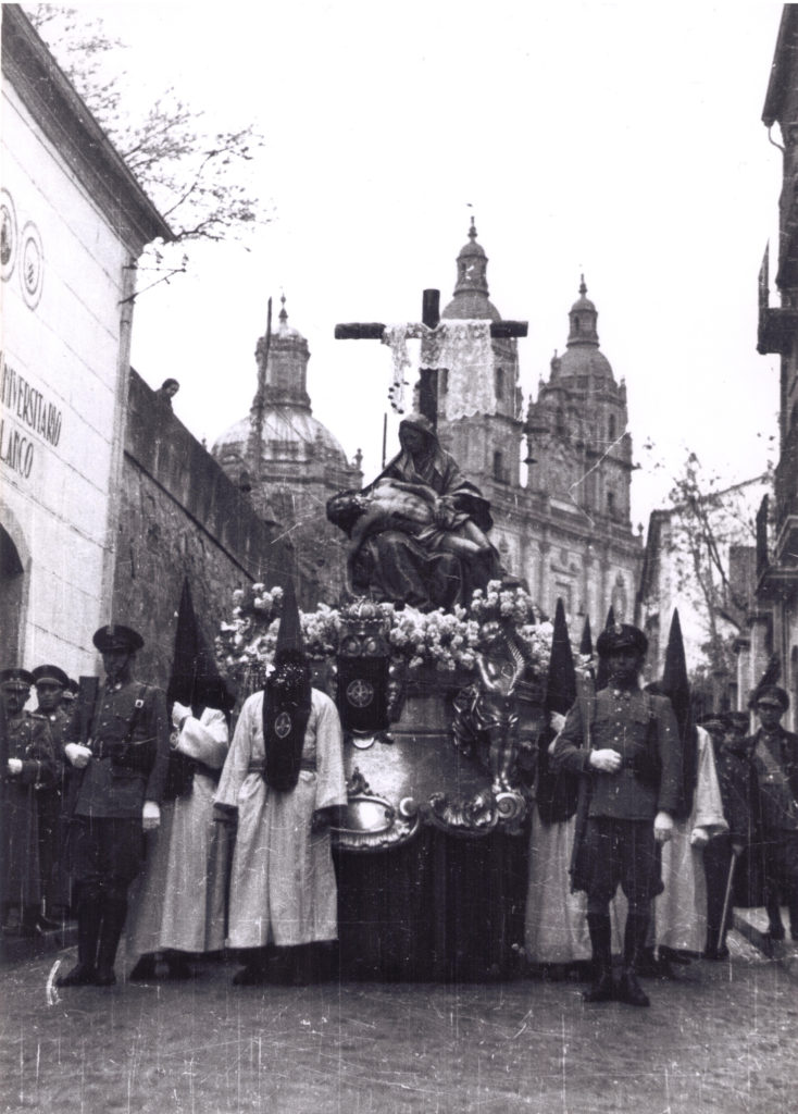 En la primera procesión de 1944 salieron las imágenes del Cristo de la Buena Muerte y de Nuestra Señora de la Piedad, de Salvador Carmona. Un año después se sumarían las imágenes de Nuestro Padre Jesús de la Pasión, de Damián Villar, y Nuestra Señora de la Esperanza, de Francisco González Macías. Y ya en 1945 se habla de los heraldos a caballo o de las bandas de cornetas y tambores