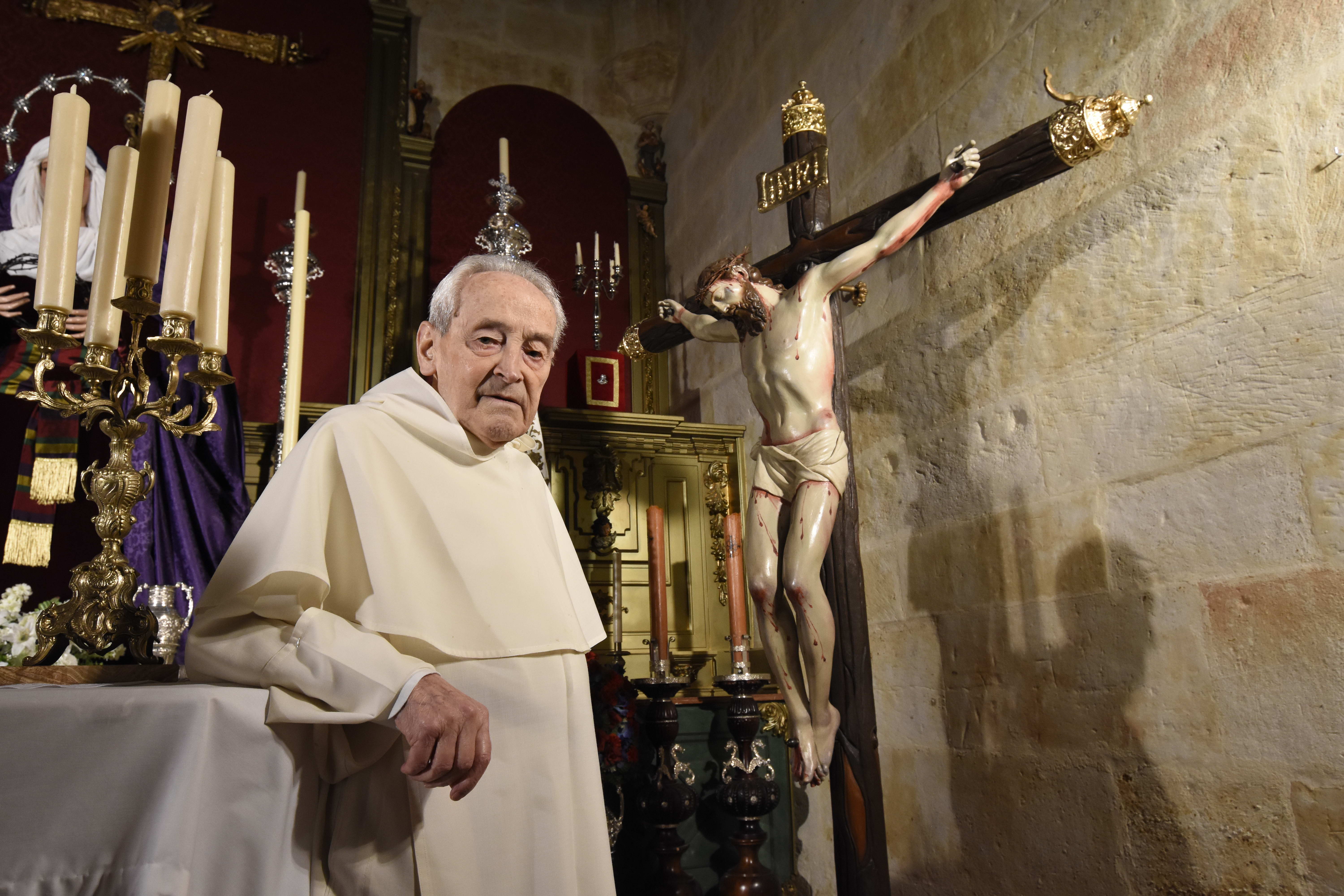 José Antonio Marcén es el dominico de San Esteban de mayor edad y memoria viva para recordar los primeros años de la Hermandad Dominicana. No conoció su fundación, hace 75 años, pero llegó a Salamanca dos años después, en 1946, con apenas 15 años. Eso le convierte en un narrador de excepción para viajar en el tiempo, a aquella década de los 40, a mediados, en la que el gremio de papel, prensa y artes gráficas decidieron crear una hermandad para la madrugada ya del Viernes Santo. Este fraile dominico recuerda algunos nombres de esos primeros pasos de la hermandad, “como Gombau, Moretón o Antonio (el de la librería de la Rúa)”.