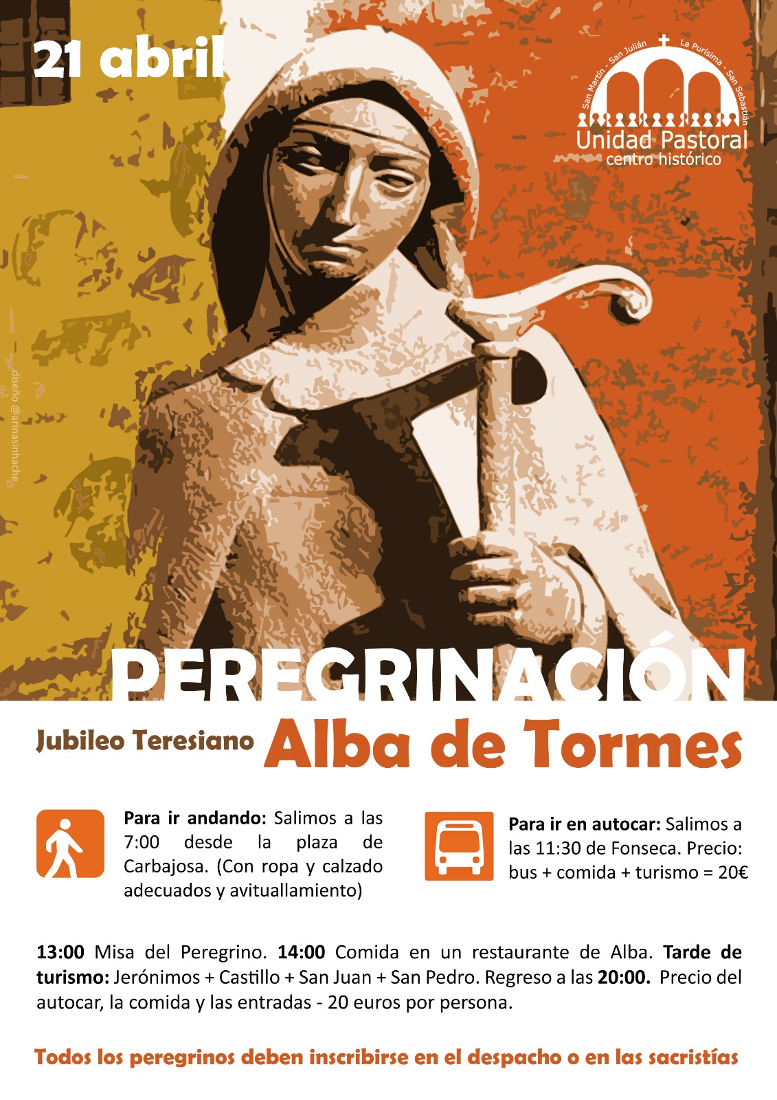 - Sábado 21 de abril. Peregrinación jubilar a Alba de Tormes. Los peregrinos que deseen realizar el camino a pie partirán a las 7.00 de la mañana desde la Plaza de Carbajosa. También se ha dispuesto un autobús que partirá a las 11.00 desde Fonseca. inscripciones en el despacho parroquial.