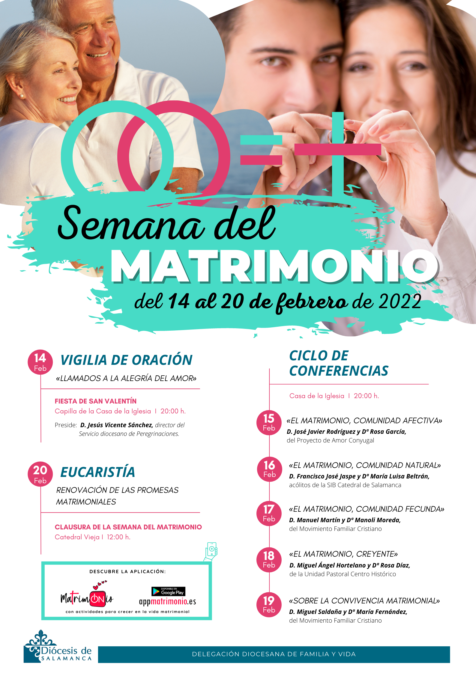 En Salamanca, los actos de la Semana del Matrimonio arrancarán el lunes, 14 de febrero, fiesta de San Valentín, con la vigilia de oración “Llamados a la alegría del amor”, que será presidida por el director del Servicio diocesano de Peregrinaciones, Jesús Vicente, a las 20:00 horas en la capilla mayor de la Casa de la Iglesia (C/ Rosario, 18).