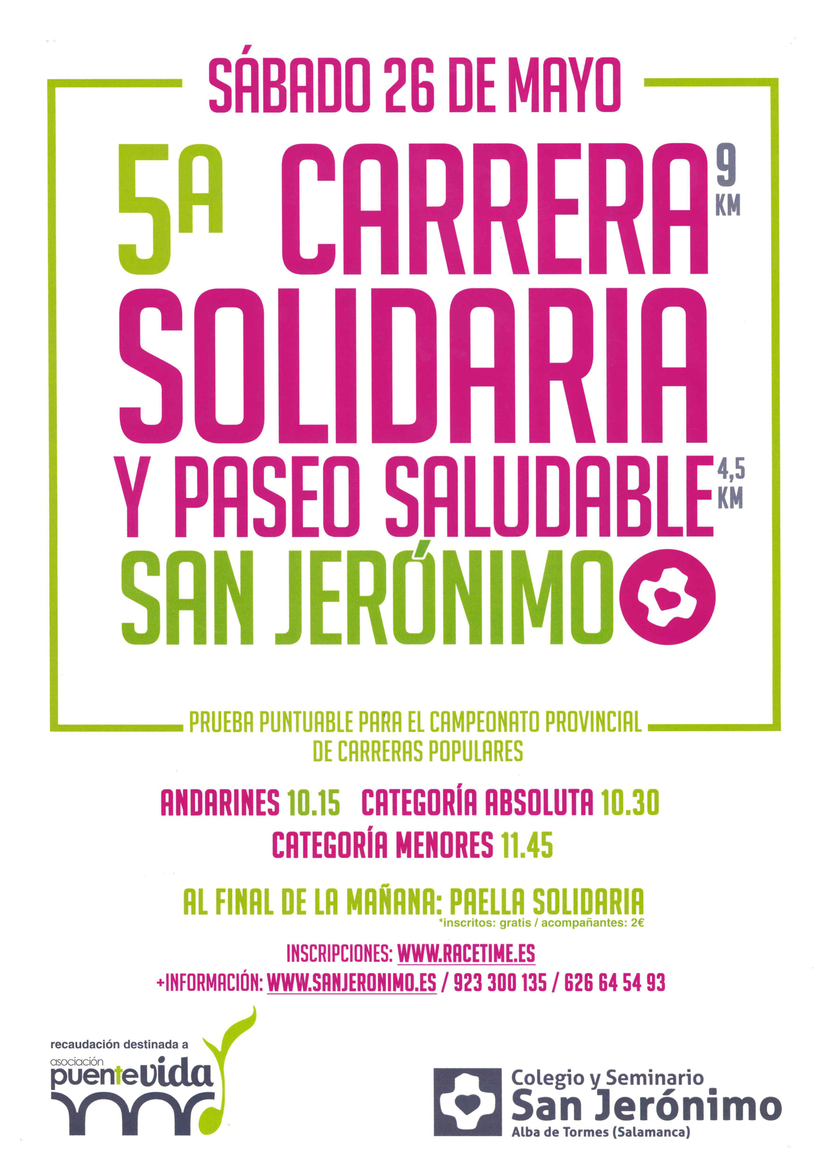 Sábado, 26 de mayo. V Carrera solidaria (9 km) y paseo saludable San Jerónimo (4,5 Km). Una prueba que se incluye por primera vez dentro del Circuito Provincial de Carreras establecido por la Diputación de Salamanca. En esta ocasión, el Colegio Seminario San Jerónimo destinará los fondos recaudados a la asociación salmantina Puente Vida, que trabaja con inmigrantes y personas que carecen de recursos o apoyos familiares.