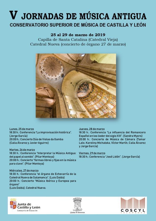 La Catedral de Salamanca acogerá del 25 al 29 de marzo la quinta edición de las Jornadas de Música Antigua organizadas por el Conservatorio Superior de Castilla y León (COSCYL). Cada día se ofrecerá una conferencia, a las 18.30 horas en la capilla de Santa Catalina (acceso por calle Tentenecio), y un concierto a las 20.00 horas., excepto el día 27 de marzo que el concierto tendrá lugar en la Catedral Nueva. Este es el programa de las jornadas: