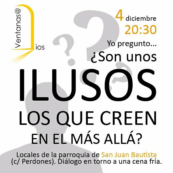 Hoy lunes , 4 de diciembre, continúan las actividades del proyecto Ventanas@Dios que promueven la Delegación diocesana de Pastoral Universitaria junto a la Asociación Pablo VI y el Foro Éffeta. En esta ocasión se va a impartir un diálogo: “Son unos ilusos ¿los que creen en el más allá?” que se realizará en torno a una cena fría. El acto tendrá lugar a las 20.30 de la tarde en la iglesia de San Juan Bautista.