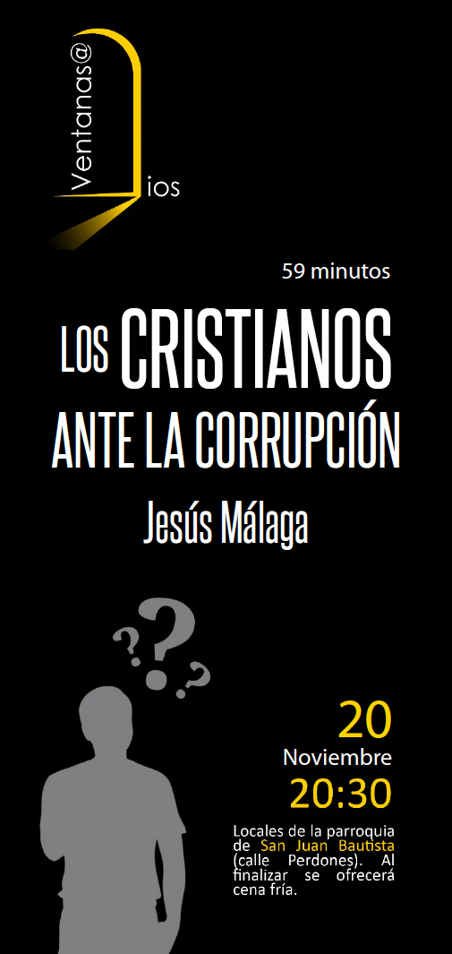 • Lunes, 20 de noviembre: 59´: “Los cristianos ante la corrupción”, a cargo de Jesús Málaga Guerrero, ex-alcalde de Salamanca, a las 20.30 h. en los locales parroquiales de San Juan Bautista (C/ Perdones).