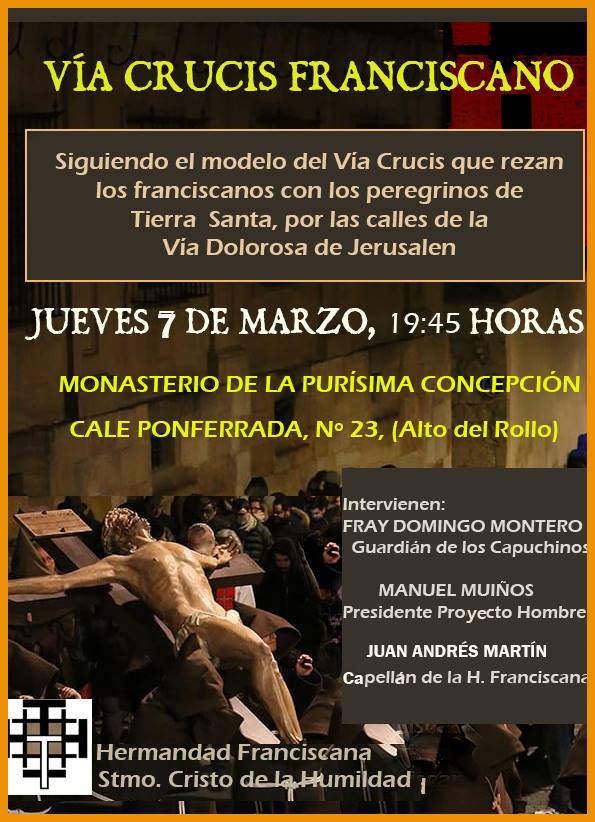 La Hermandad Franciscana ha organizado el Vía Crucis Franciscano de Jerusalén el jueves, 7 de marzo, a las 19:45 horas, en la capilla del monasterio de la Purísima Concepción, Franciscas Clarisas Descalzas, en la calle Ponferrada número 23.