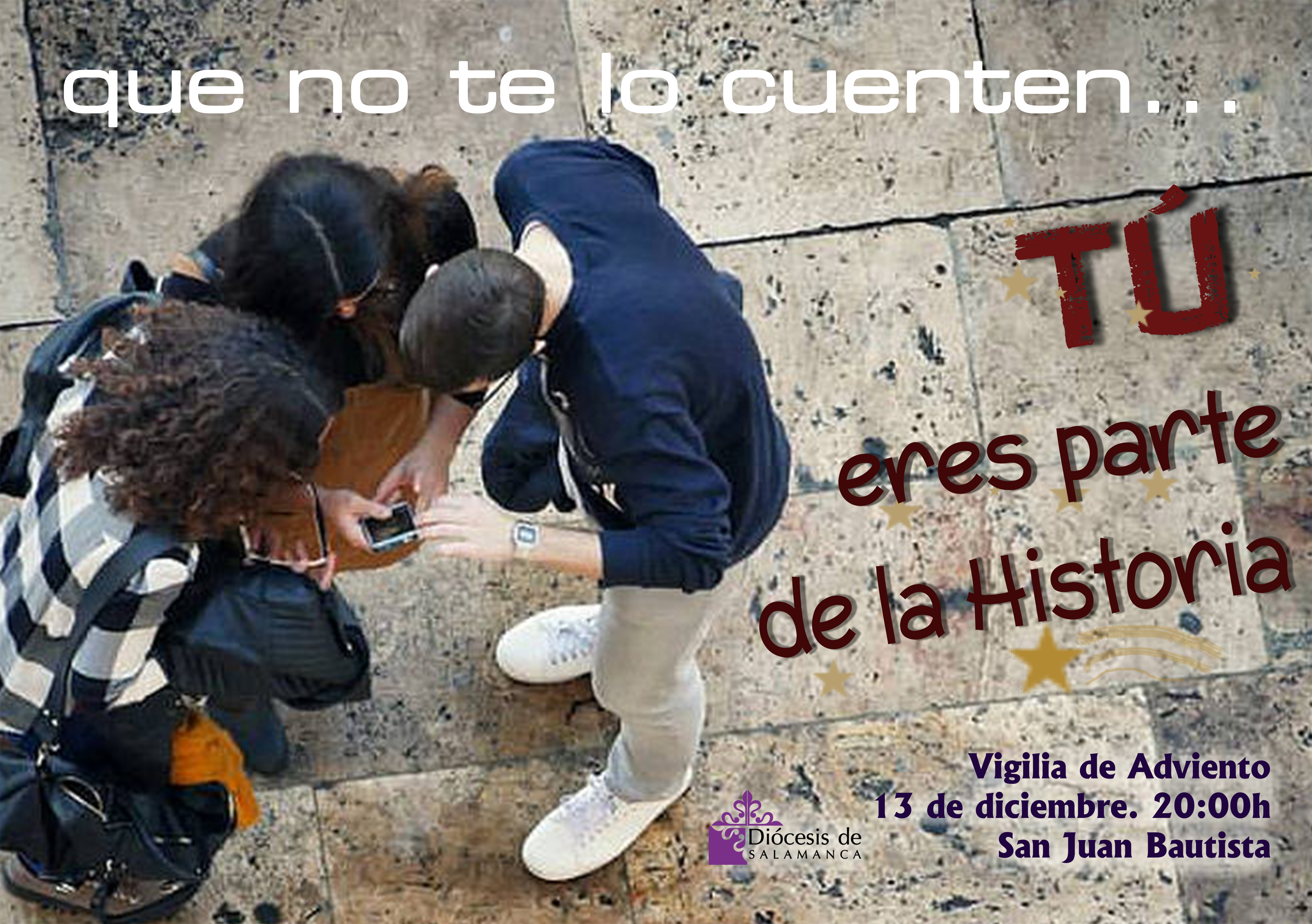 “Que no te lo cuenten. Tú eres parte de la historia”, es el lema de la Vigilia diocesana de Adviento que se va a celebrar el miércoles 13 de de diciembre, a las 8.00 de la tarde en la iglesia de San Juan Bautista. La celebración será presidida por el obispo de Salamanca, Mons. Carlos López y contará con la animación del Grupo de Música diocesano. Se convoca a participar especialmente a los jóvenes de nuestra diócesis.