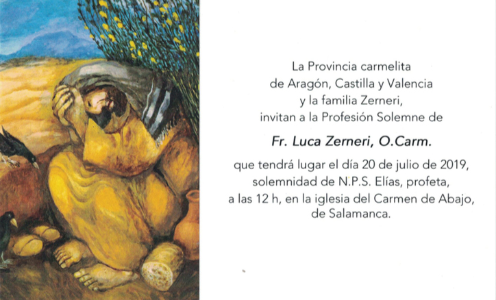 La comunidad de Carmelitas Calzados de Salamanca invita a participar en la vigilia de oración que se celebrará el viernes 19 de julio, a las 20.00 horas, en la iglesia del Carmen de Abajo. La vigilia predecerá a la profesión solemne de uno de sus miembros, Fr. Luca Zerneri que tendrá lugar al día siguiente, 20 de julio, solemnidad del profeta Elías, en el mismo templo, a las 12.00 del mediodía.