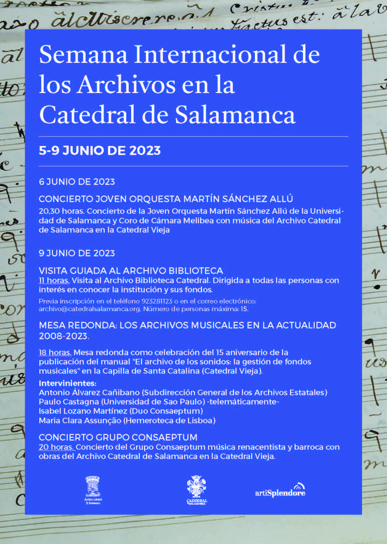 Y el viernes, 9 de junio, está prevista la mesa redonda: “Los archivos musicales de la actualidad 2008-2023”, a las 18:00 horas en la capilla Santa Catalina de la Catedral. En el acto van a intervenir Antonio Álvarez Cañibano, de la Subdirección general de los Archivos Estatales; el musicólogo Paulo Castagna, de la Universidad de Sao Paulo; Isabel Lozano, del Duo Consaeptum y Maria Clara Assunçao, de la Biblioteca Nacional de Portugal. La jornada concluirá con un concierto del grupo Consaeptum música renacentista y barroca que interpretará música del Archivo Catedral de Salamanca, a las 20:00 horas en la Catedral vieja.