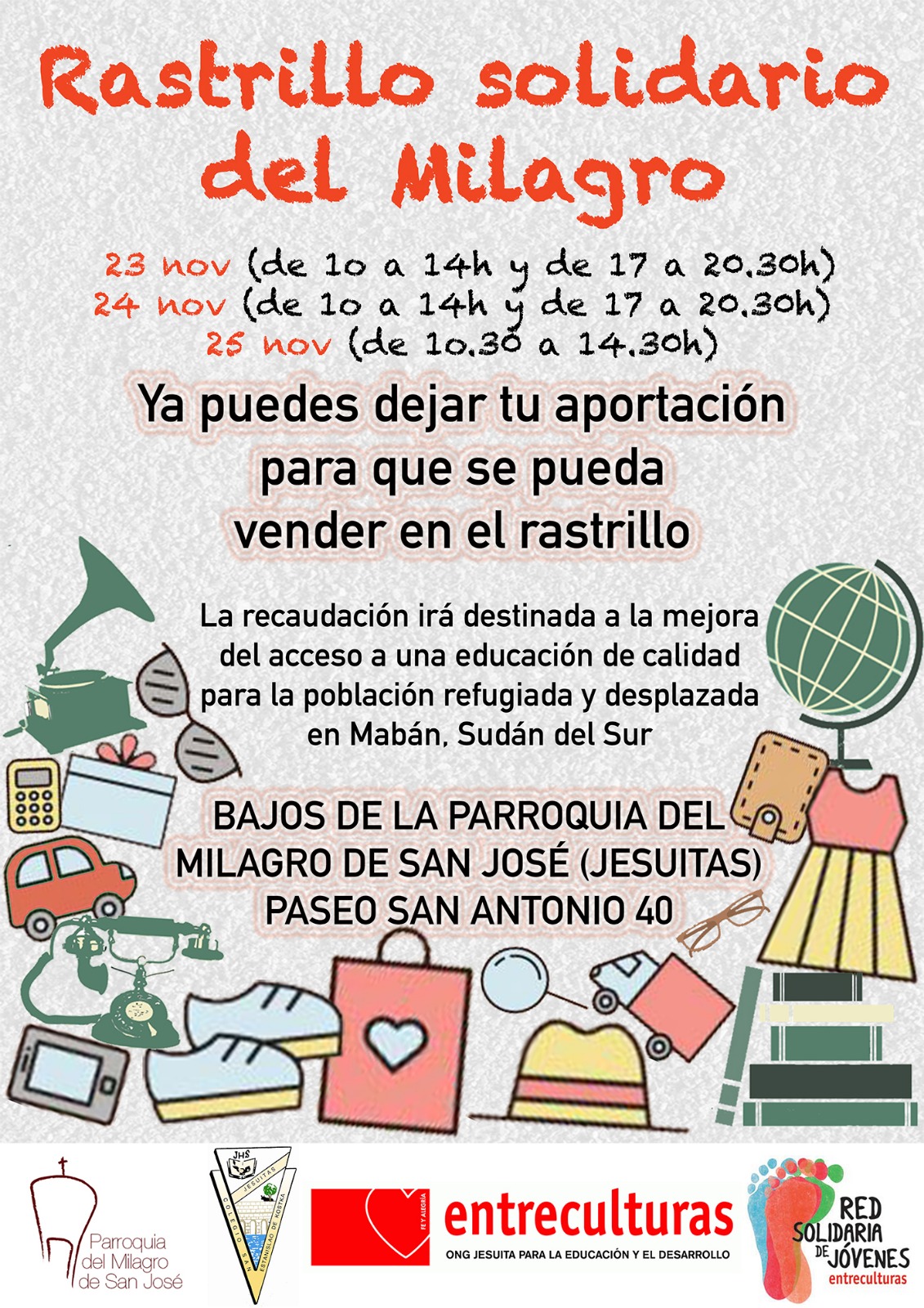 Entreculturas Salamanca, en colaboración con la parroquia del Milagro de San José y la red solidaria del Colegio San Estanislao de Kostka, organiza una nueva edición del Rastrillo Solidario del Milagro. El Rastrillo se va a celebrar los días 23, 24 y 25 de noviembre en los bajos de la parroquia (Pso. San Antonio, 40) y este año destinará su recaudación a un proyecto que permitirá que la población refugiada y desplazada en Mabán, una población de la República africana de Sudán del Sur, tenga acceso a una educación de calidad.